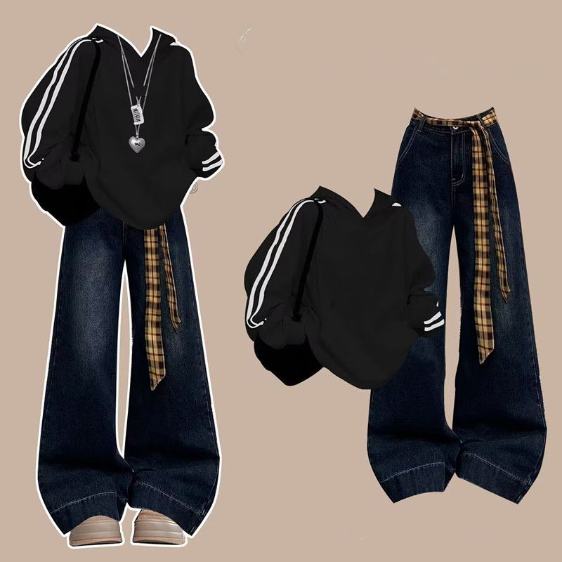 秋冬韩系穿搭连帽美式加绒卫衣女秋季2025爆款小个子宽松慵懒套装