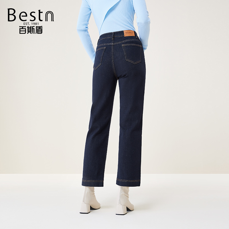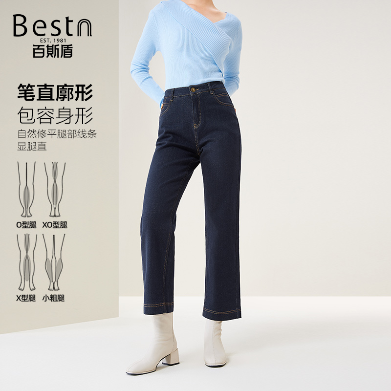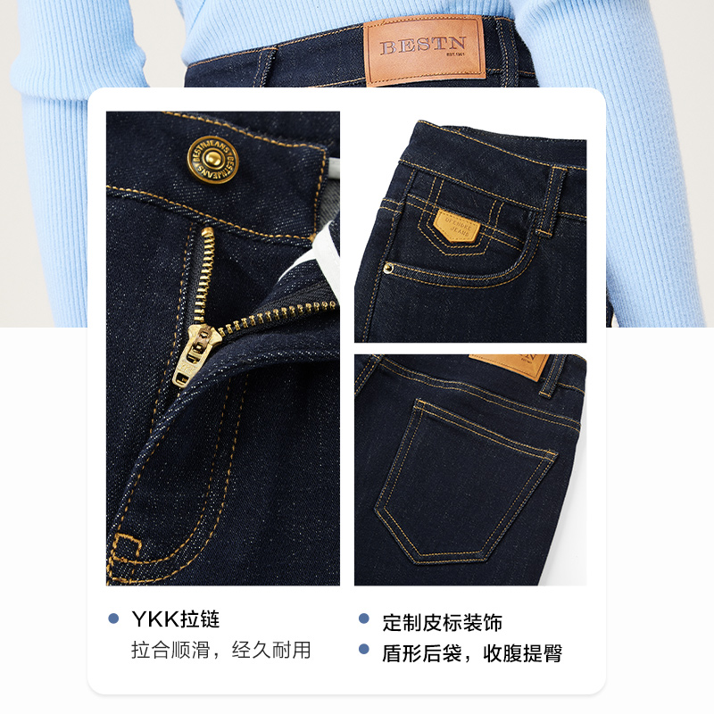 百斯盾官方【轻暖绒】女装牛仔裤秋冬不易褪色丹宁风九分筒裤