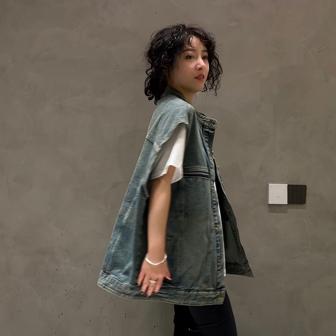欧货2024春季新品oversize做旧水洗马甲设计牛仔夹克上衣外套ins