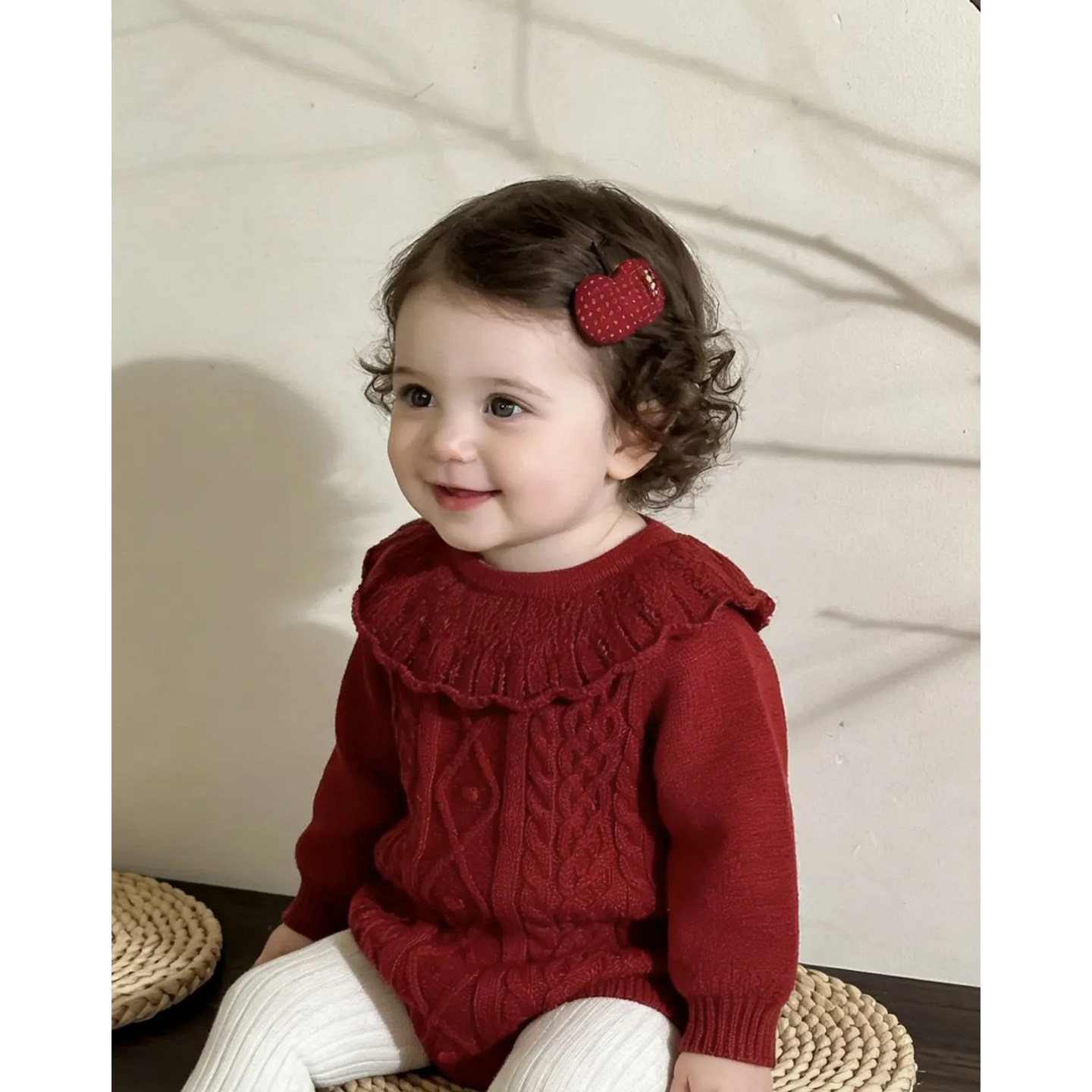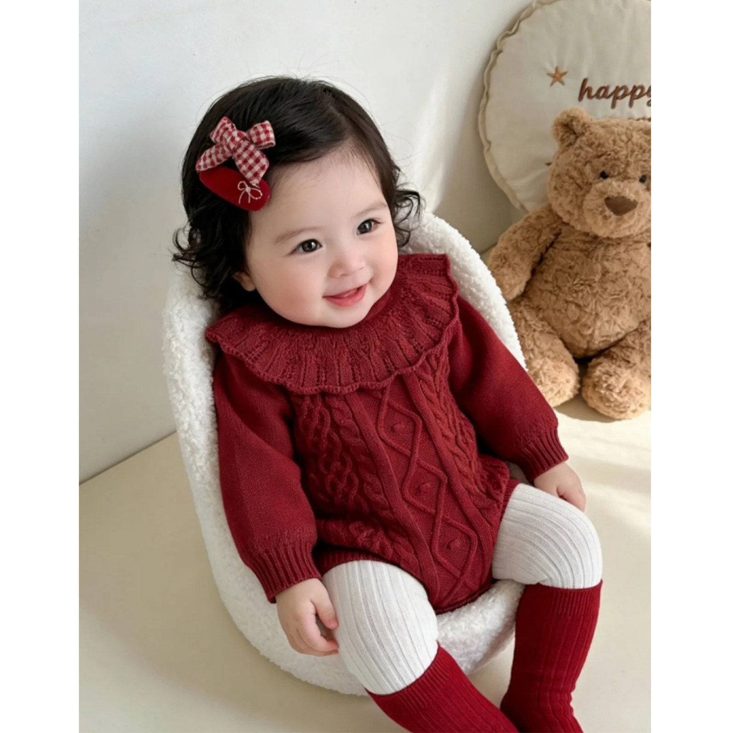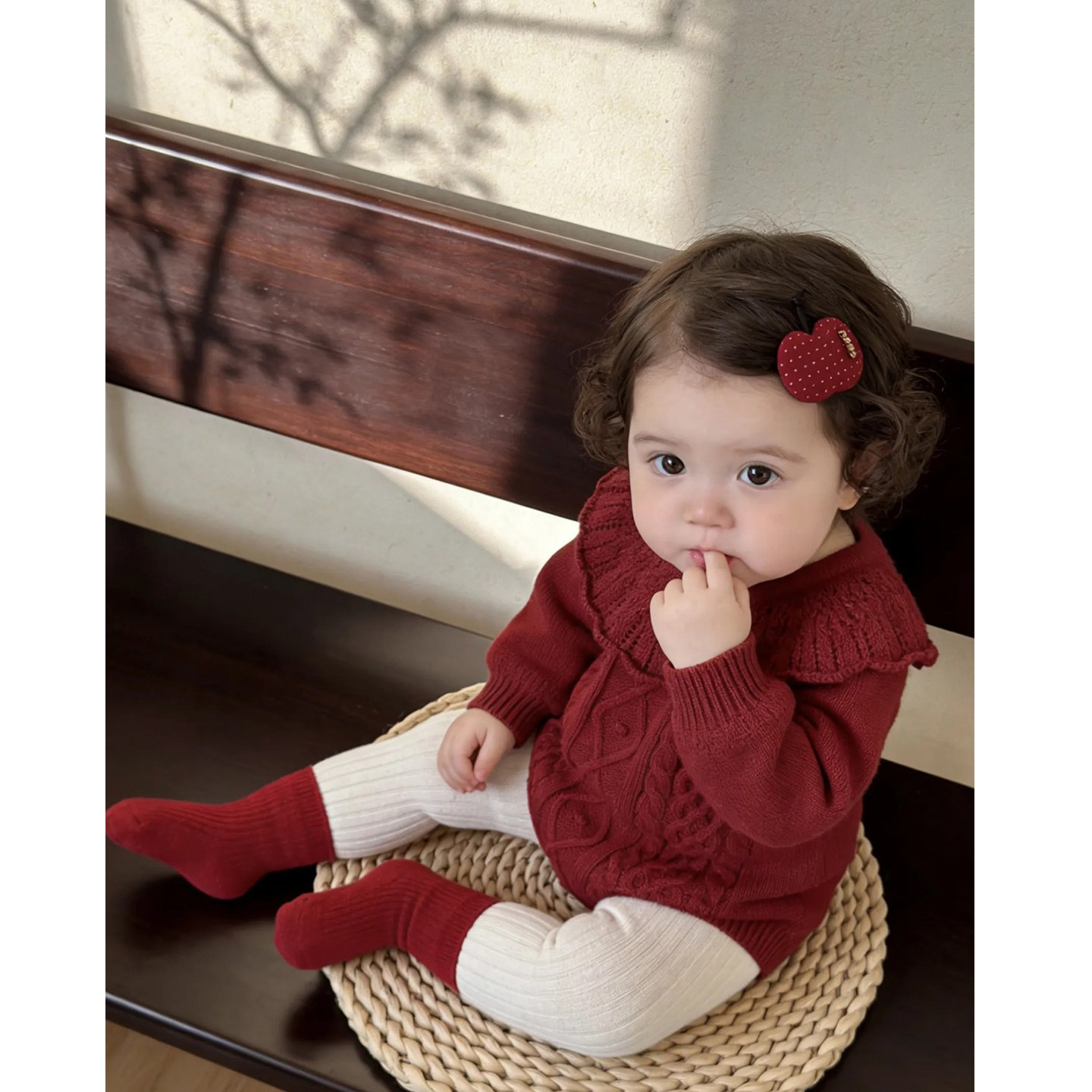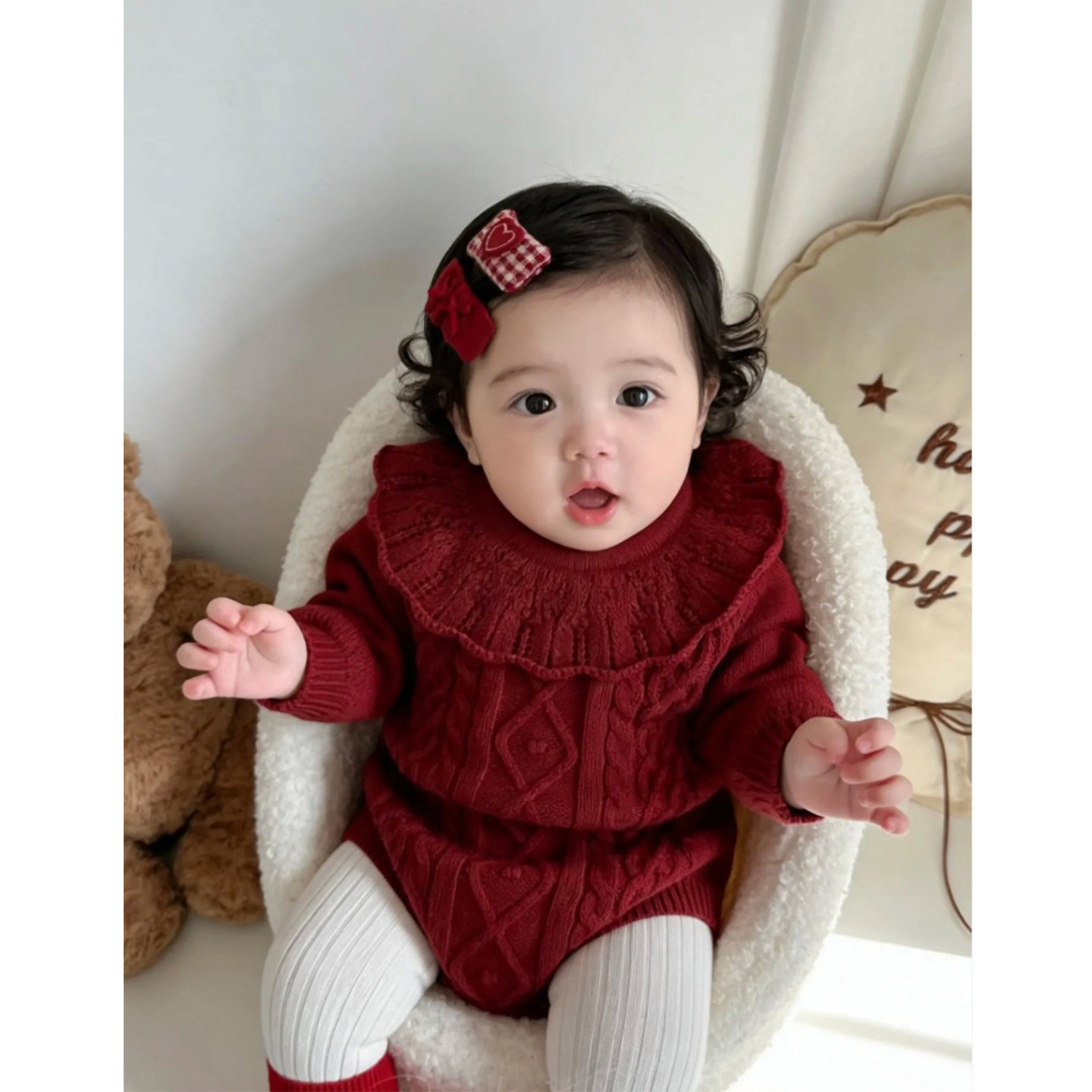 婴儿冬季可爱红色针织毛衣女宝宝长袖荷叶领针织包屁衣小月龄爬服