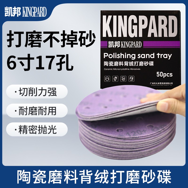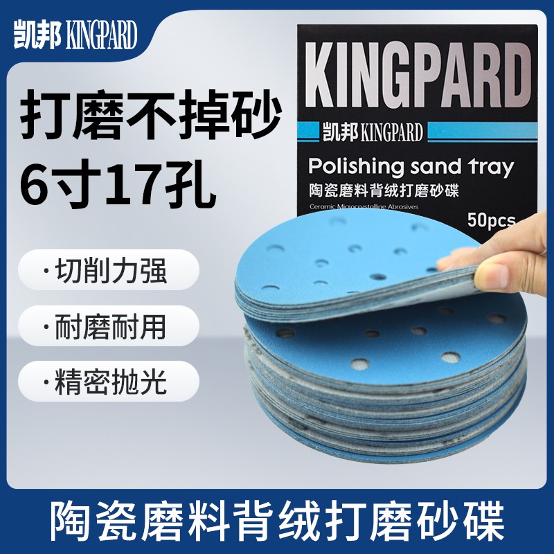 凯邦陶瓷磨料砂纸6寸17孔汽车不掉砂抛光美容圆吸盘背绒打磨砂碟