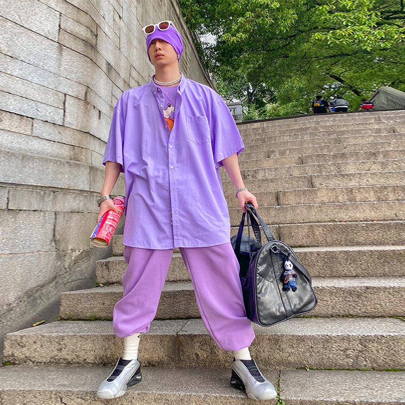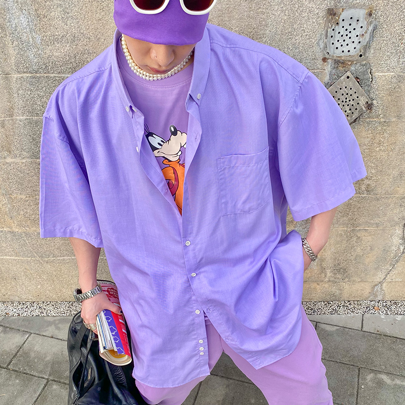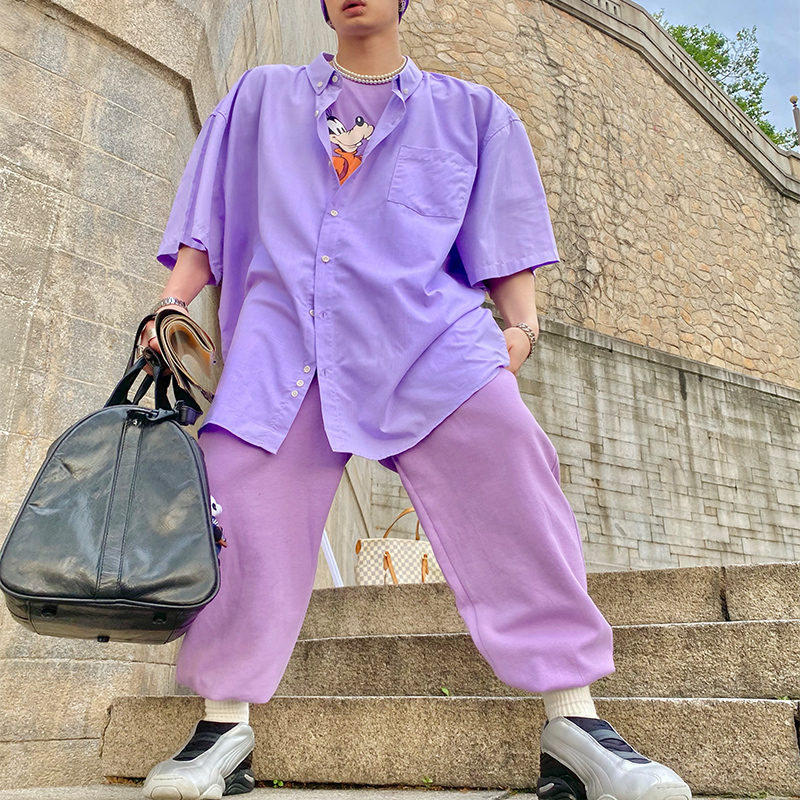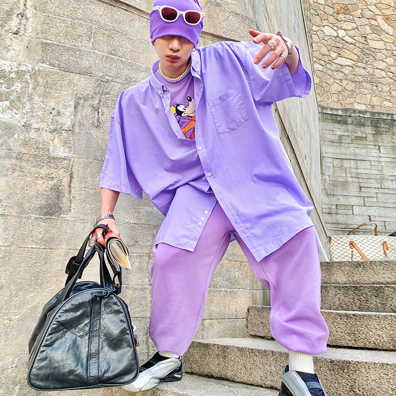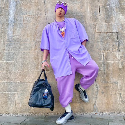 BUDDYBODY美式街头大码休闲短袖衬衫宽松嘻哈紫色长裤运动套装