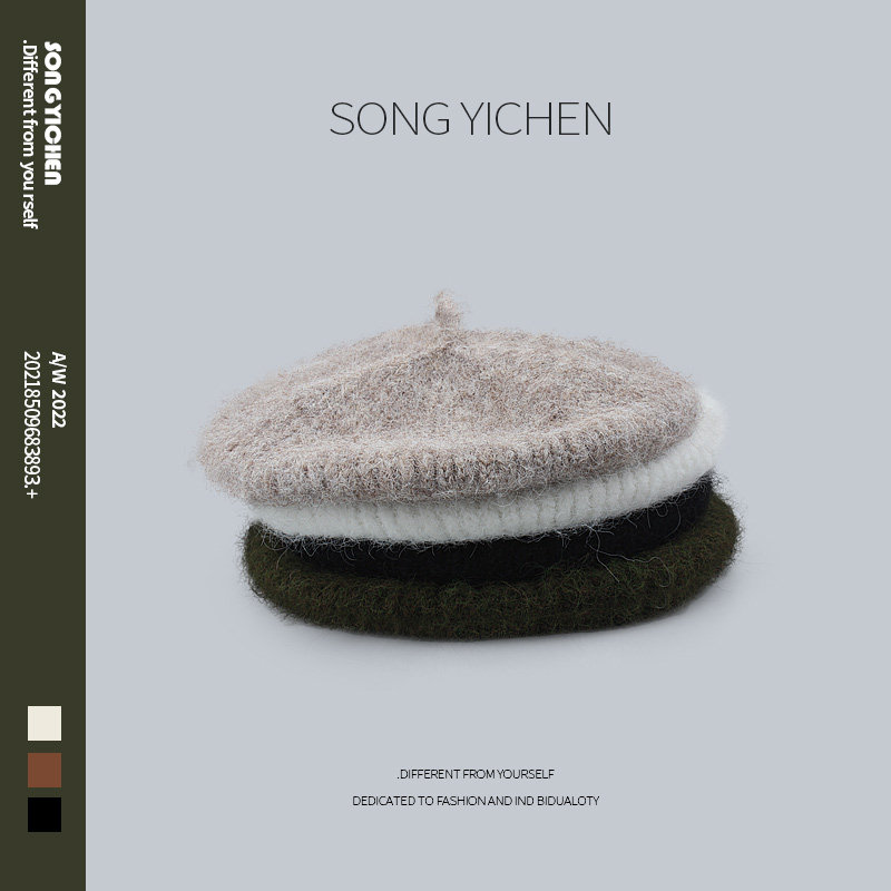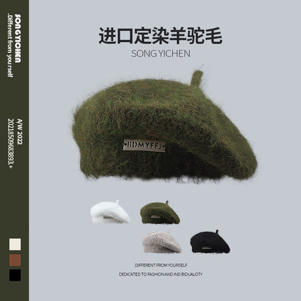日系马海毛铁标针织贝雷帽女秋冬毛绒画家帽百搭显脸小羊毛线帽子