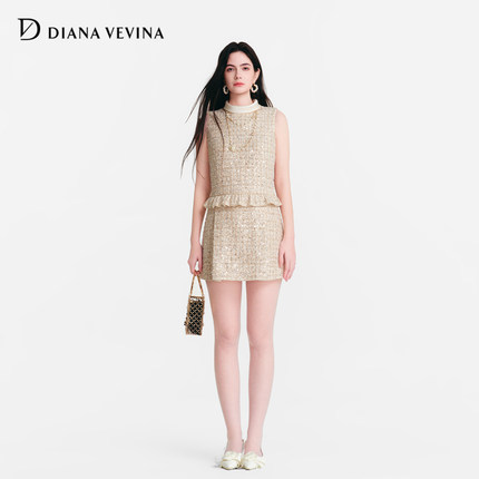 DIANAVEVINA2026春季新款小香风无袖粗花呢女A字修身背心连衣短裙