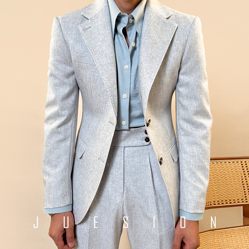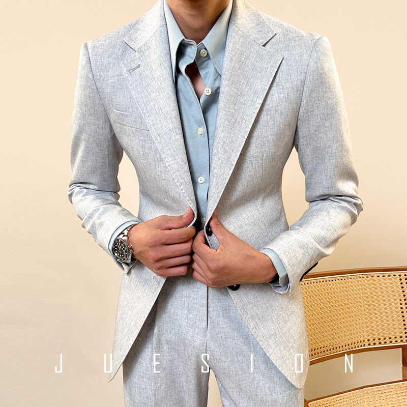 JUESION 意式那不勒斯亚麻薄款西服套装男春夏款修身休闲商务西装