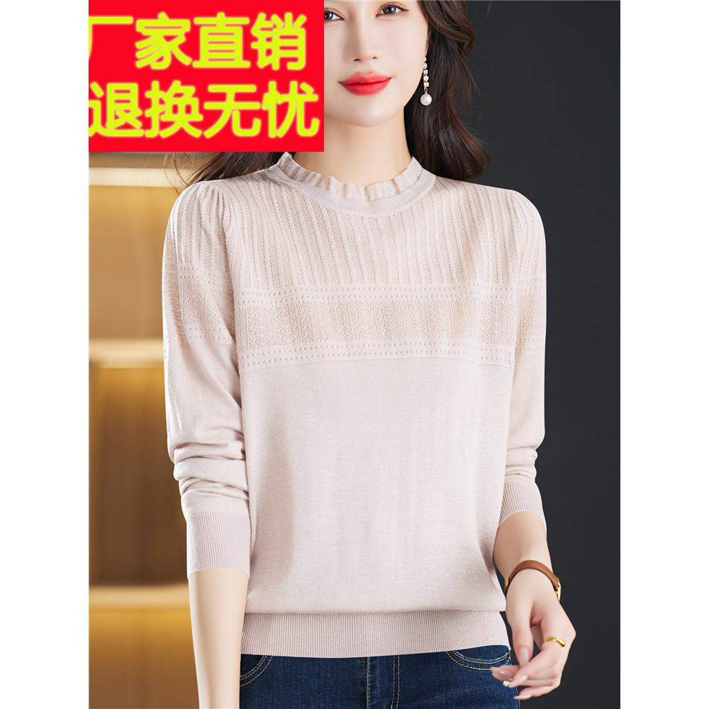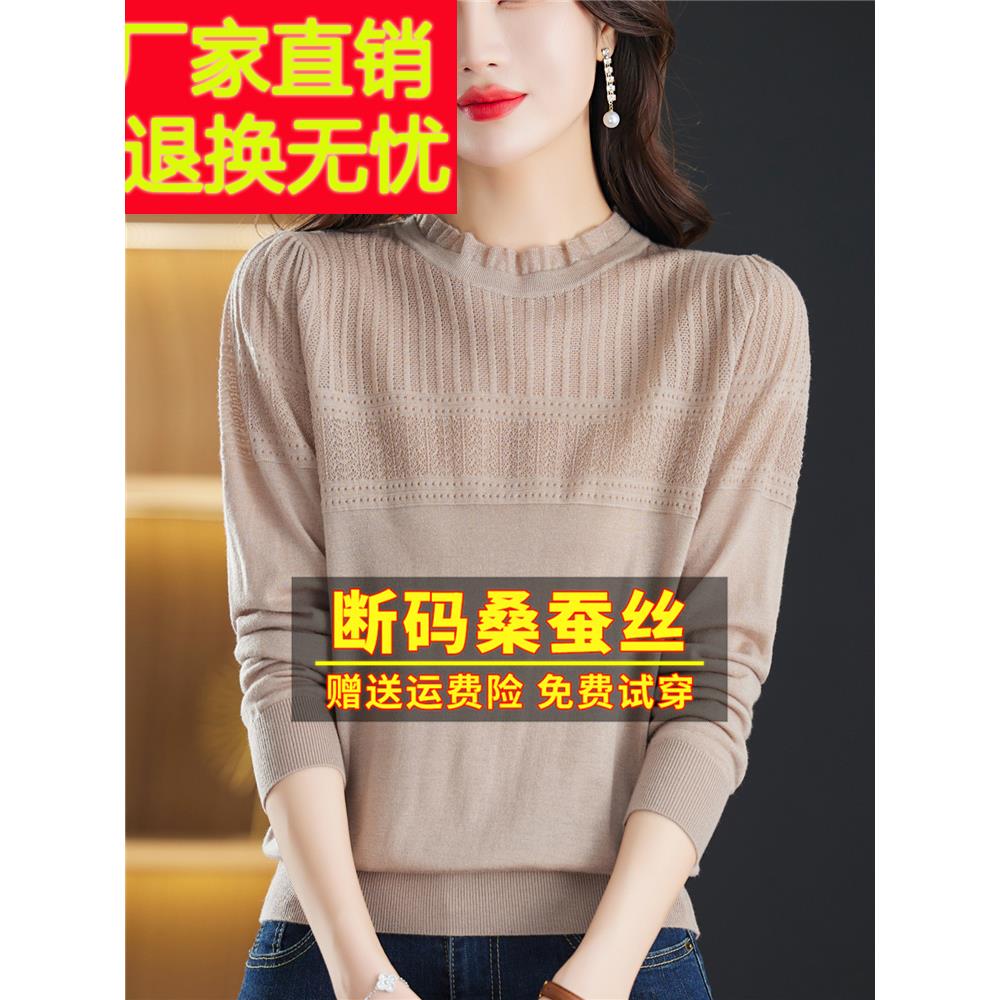 春秋桑蚕丝长袖t恤蕾丝网纱白色针织打底漂亮内搭洋气小衫女上衣