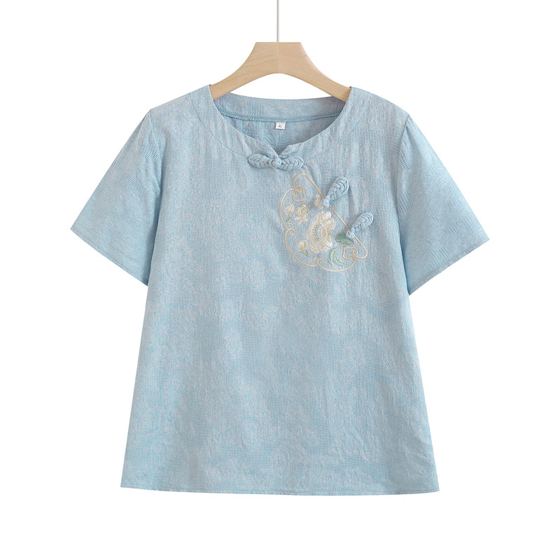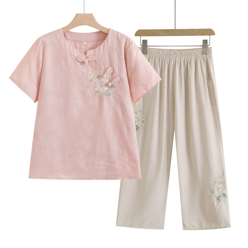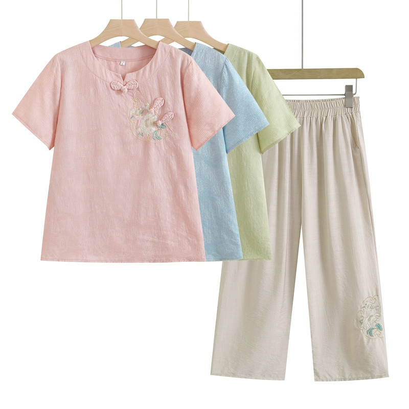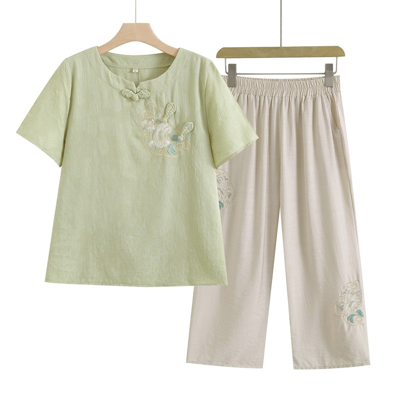 妈妈夏装奶奶中老年女棉麻短袖刺绣T恤民族风老人上衣服洋气套装