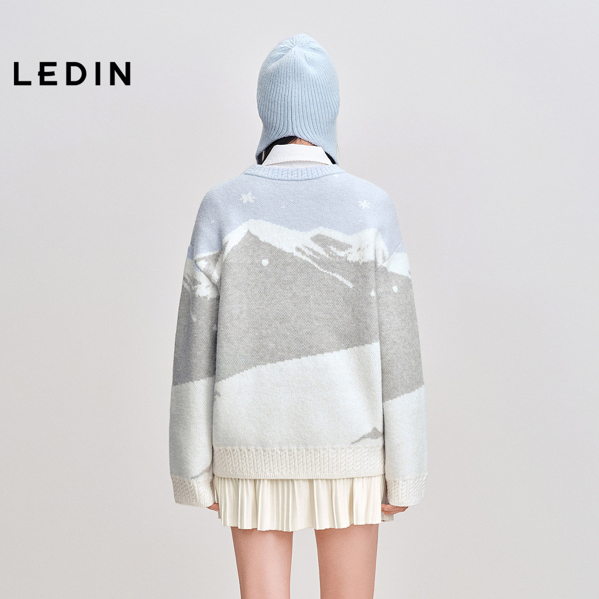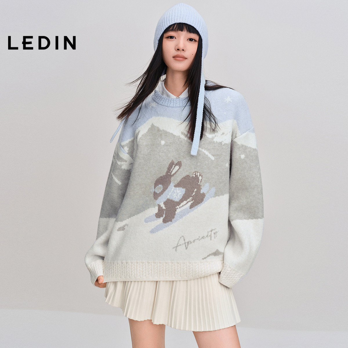 乐町滑雪兔宽松毛衣女冬季新款银丝雪山大图圆领毛针织衫