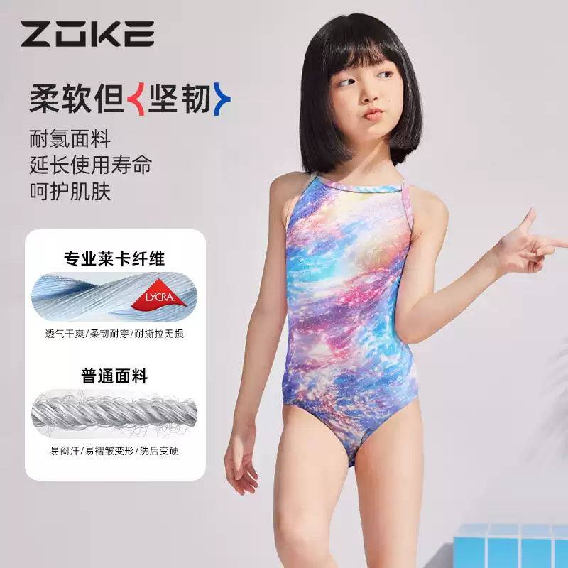 zoke洲克儿童泳衣女童连体三角泳衣炫彩鎏金花专业竞速干比赛泳装