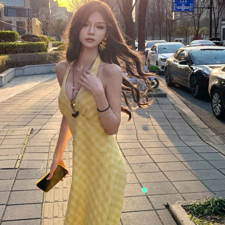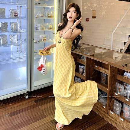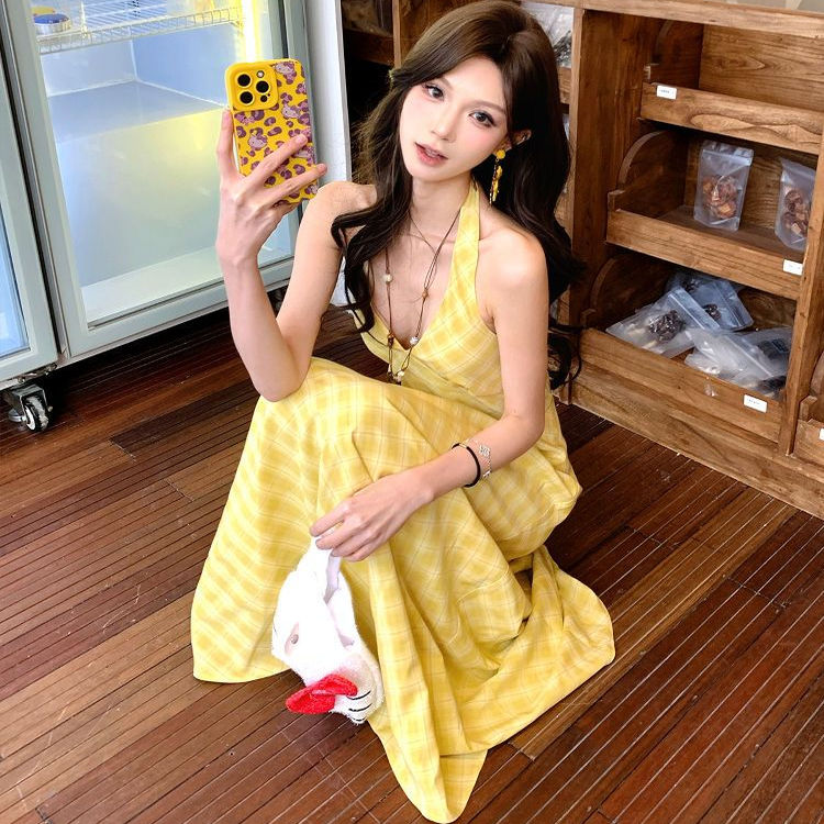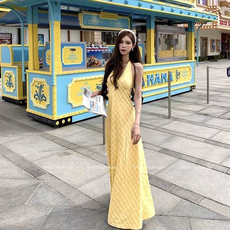 法式复古黄色格纹挂脖连衣裙女夏季新款海边度假风修身显瘦长裙子