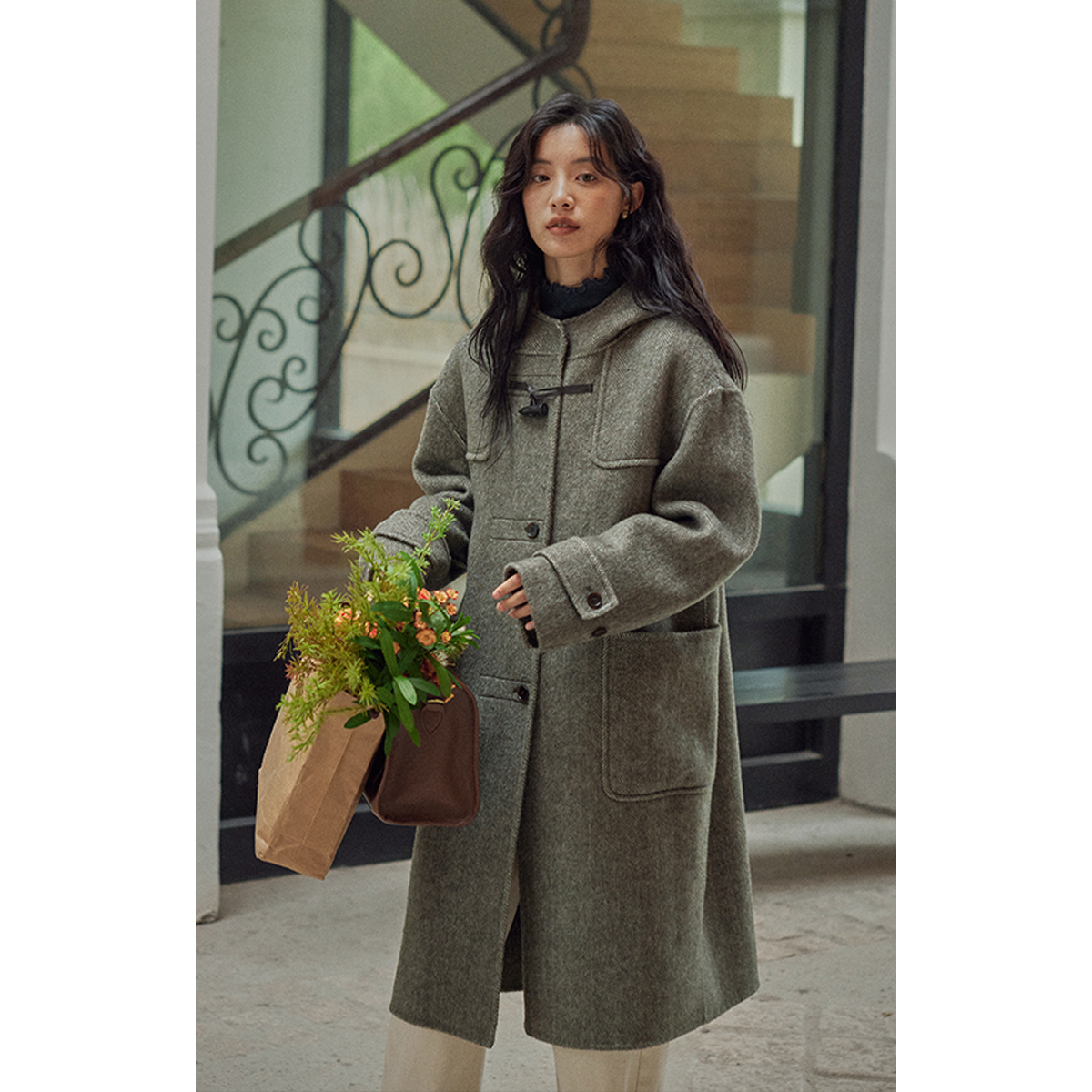 solighter 全羊毛人字纹连帽牛角扣大衣女秋冬新款中长款毛呢外套