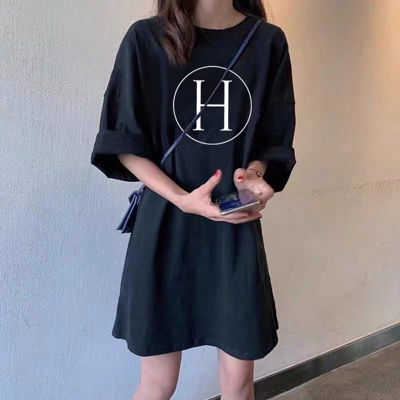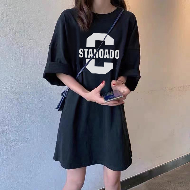 黑色短袖t恤女夏季宽松下衣失踪中长款体恤连衣裙遮屁股上衣ins潮