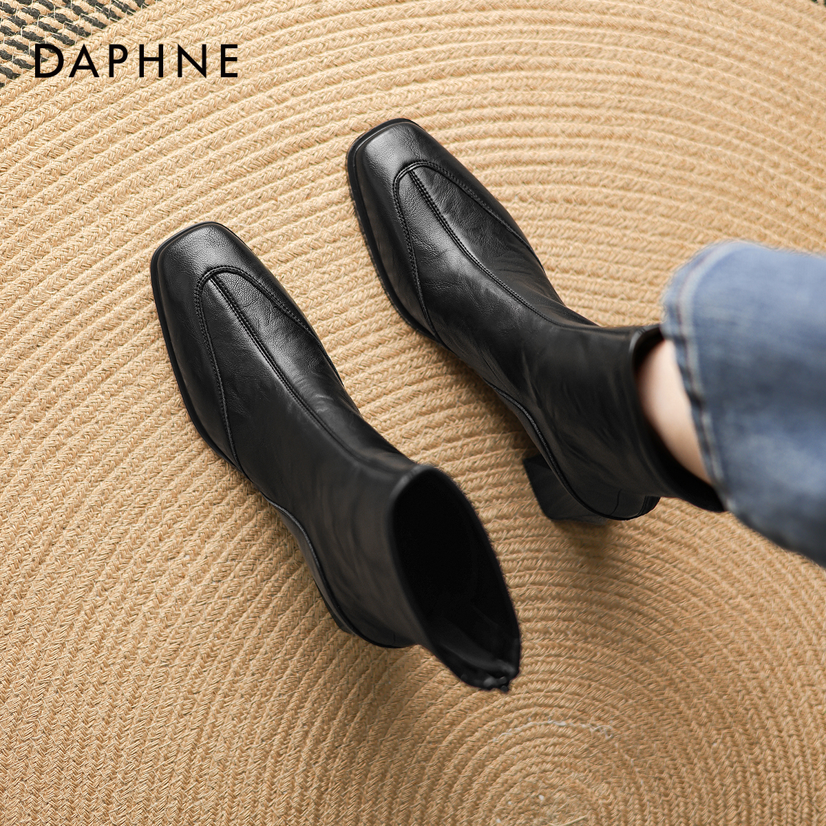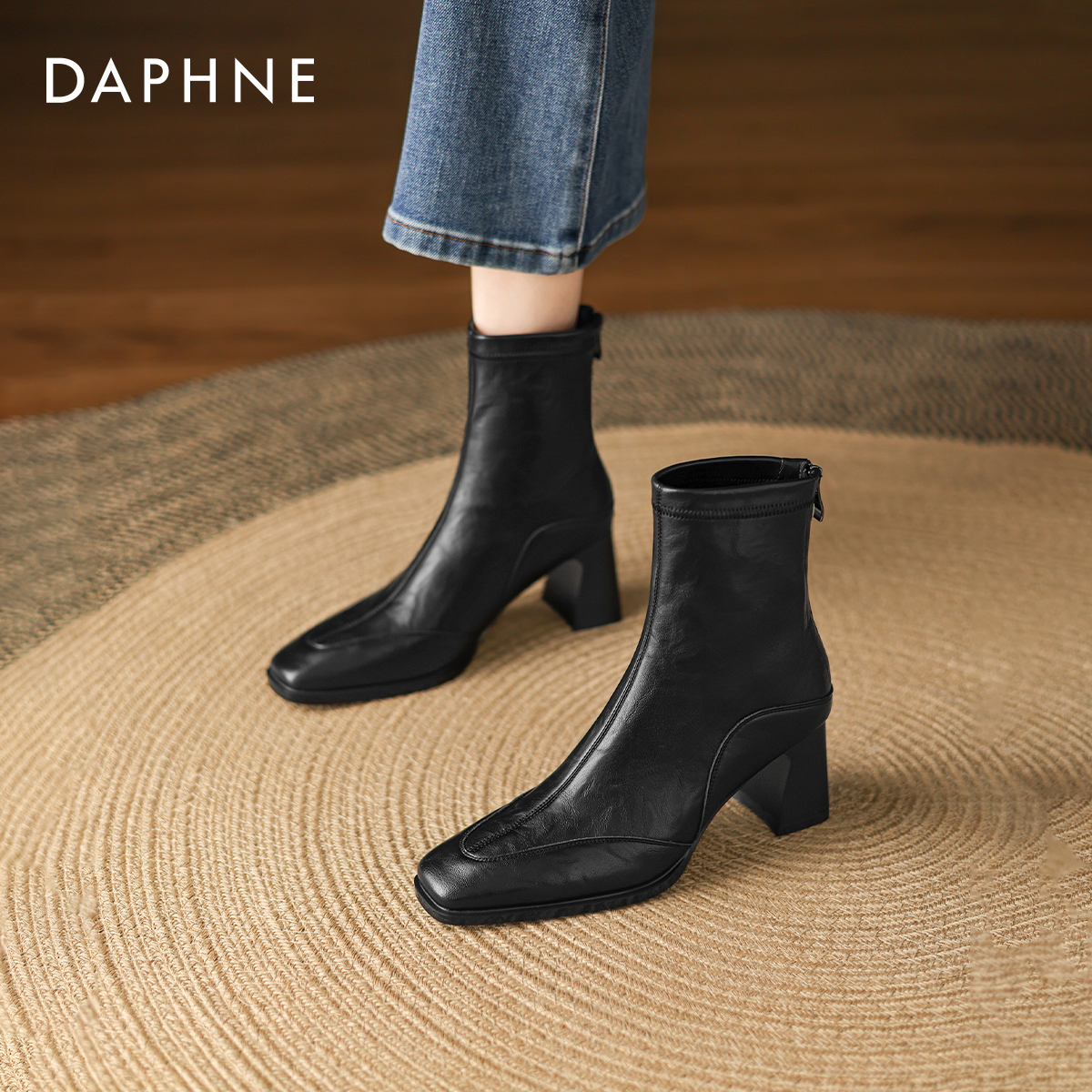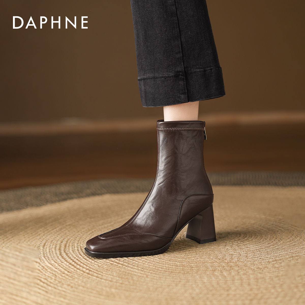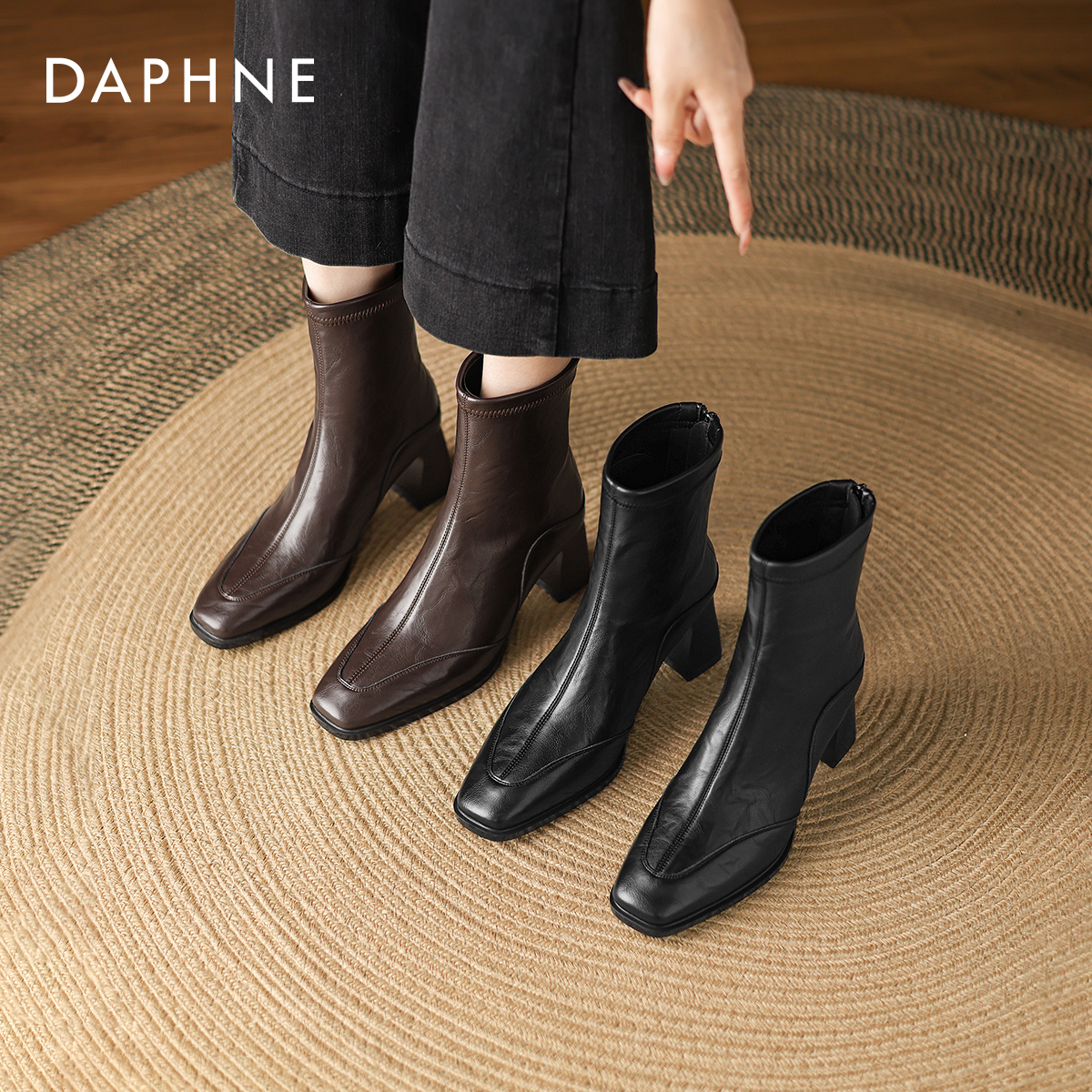 达芙妮高跟短靴女2025秋冬新款复古英伦粗跟弹力瘦瘦靴加绒马丁靴