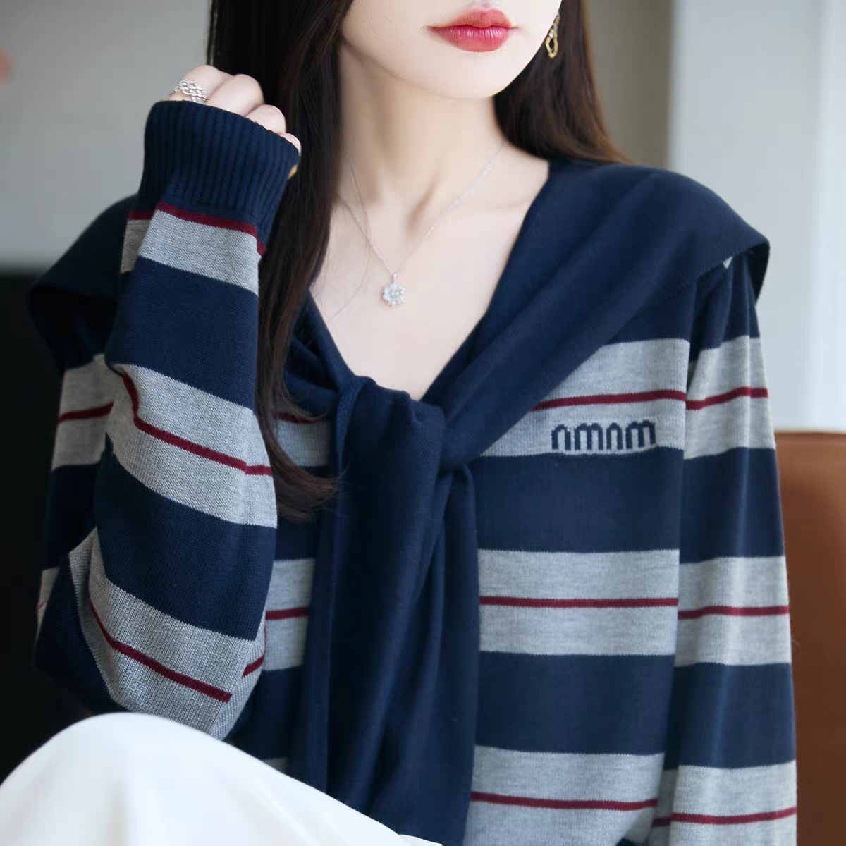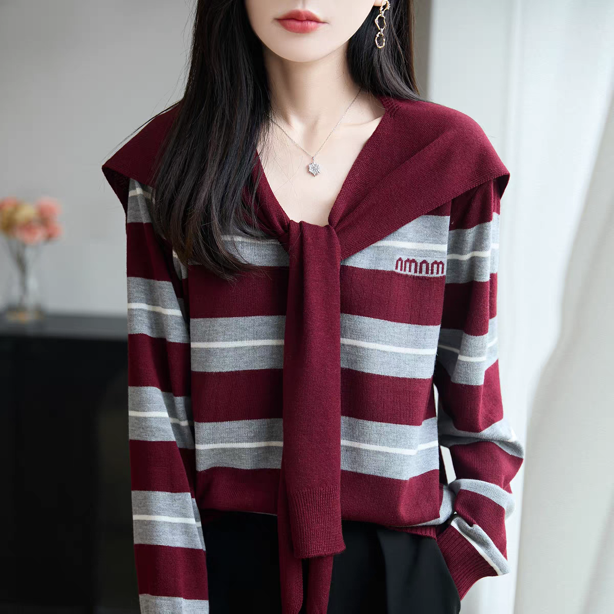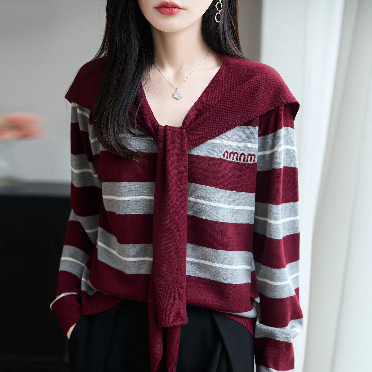 假两件25秋冬穿搭V领披肩条纹羊毛针织衫女字母宽松休闲长袖毛衣