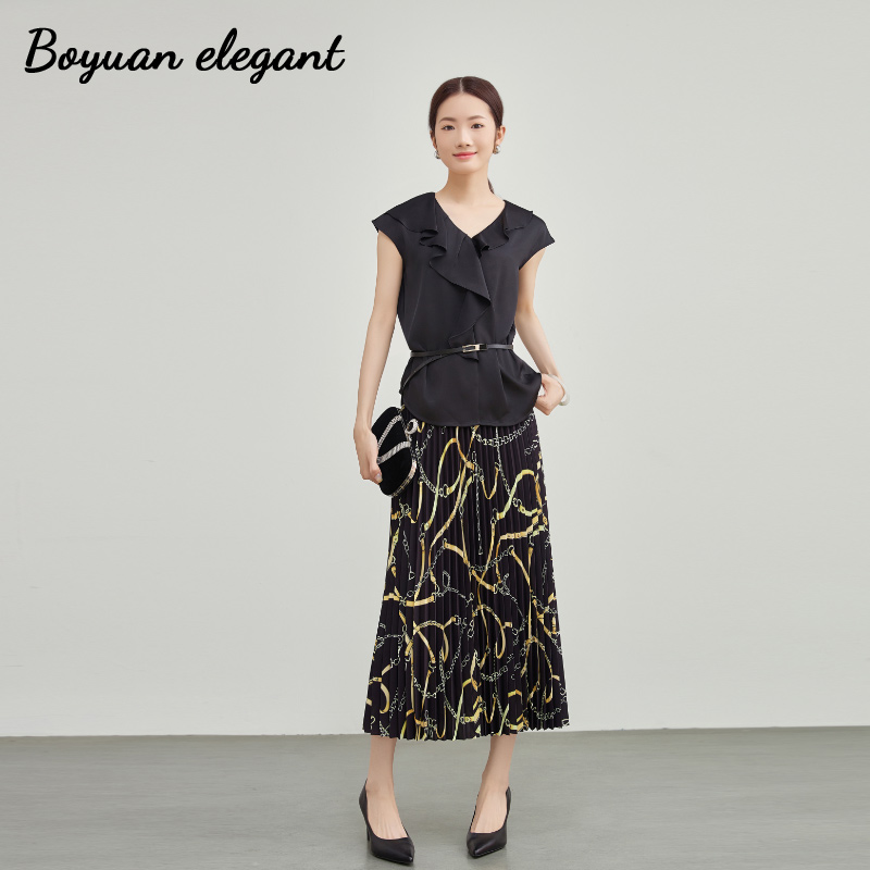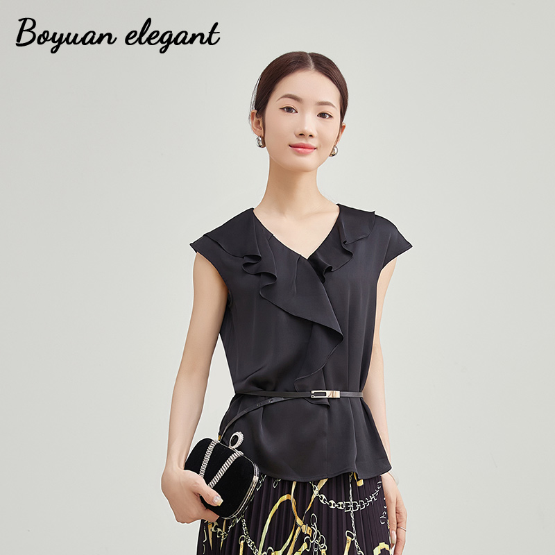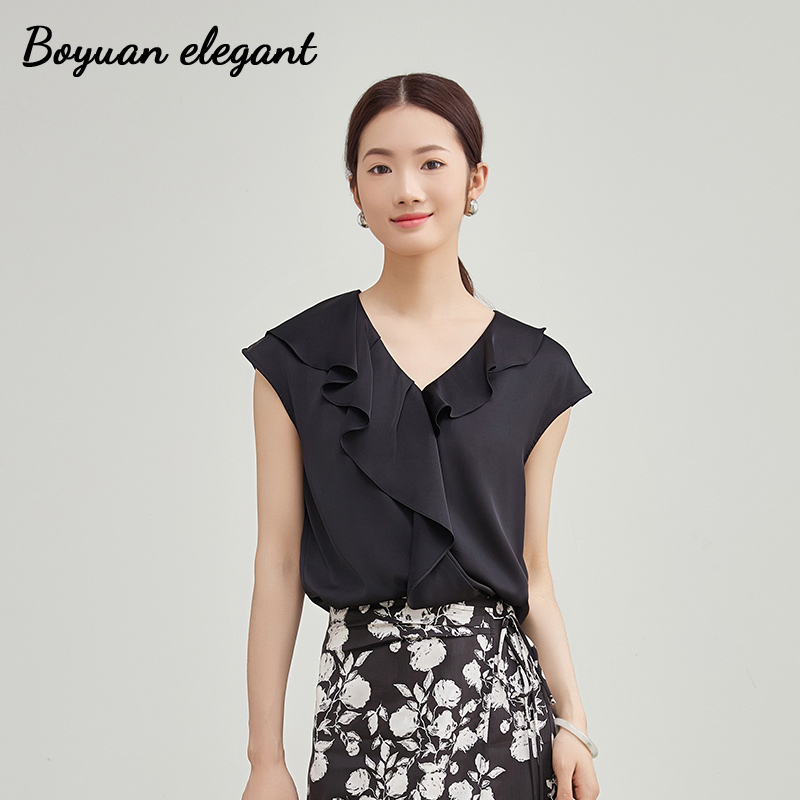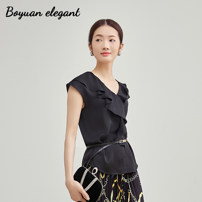 柏媛黑色法式时尚荷叶边无袖衬衫女2025设计感显瘦休闲V领打底衫