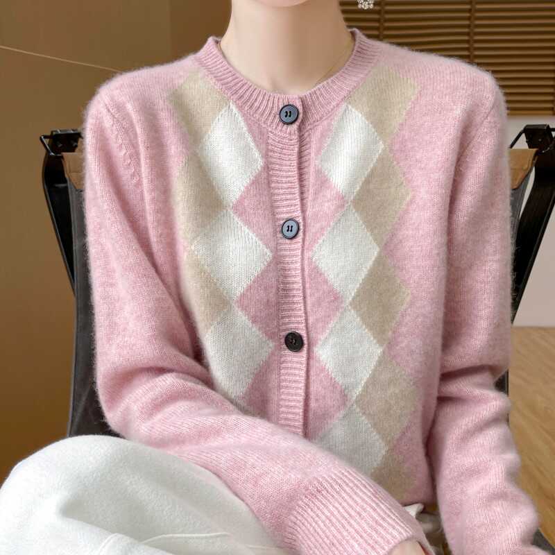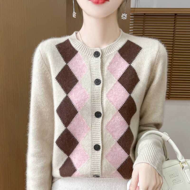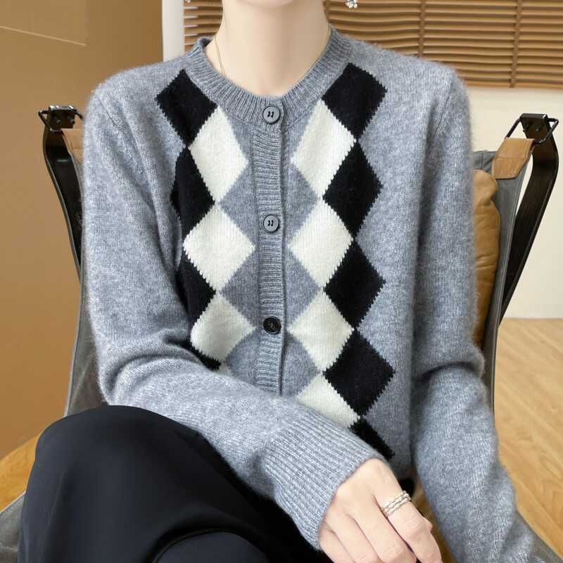 2025秋冬100%纯羊毛开衫女菱形格拼色毛衣外套宽松羊绒衫针织上衣
