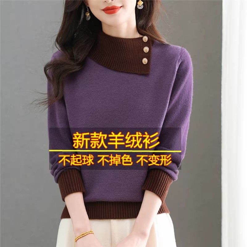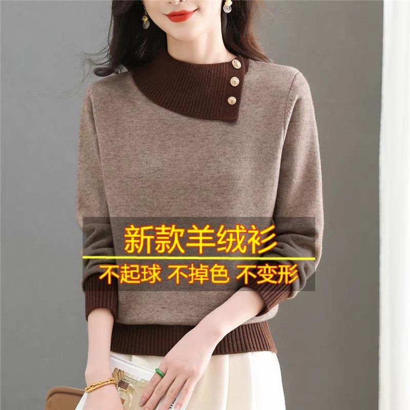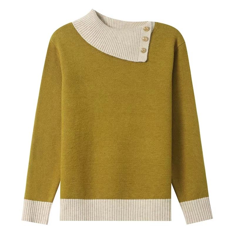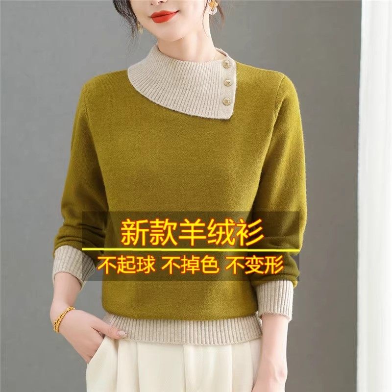 秋冬新款羊毛衫女时尚宽松翻领拼色洋气加厚针织打底外穿百搭毛衣