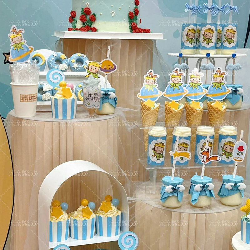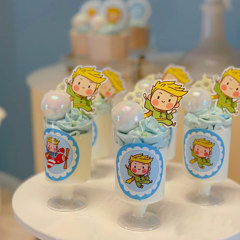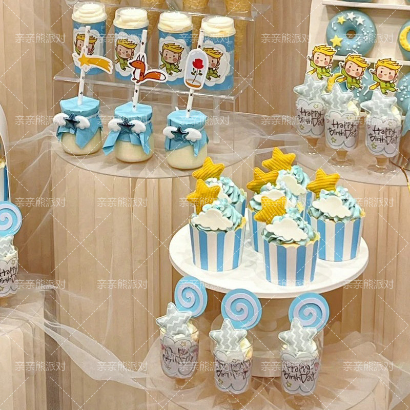 宝宝周岁甜品台装饰蓝色小王子推推乐慕斯贴纸布丁瓶纸杯星星插件