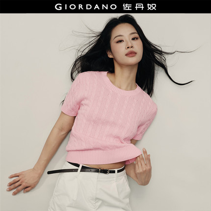 【韩国明星同款】佐丹奴女装纯棉绞花圆领短款短袖针织衫05355316