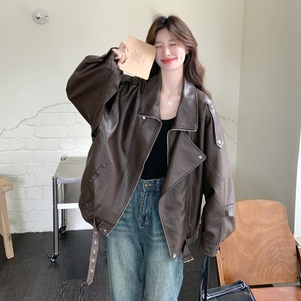 拉夏贝尔2025正流行美拉德酷飒风机车服夹克女秋咖色短款皮衣外套