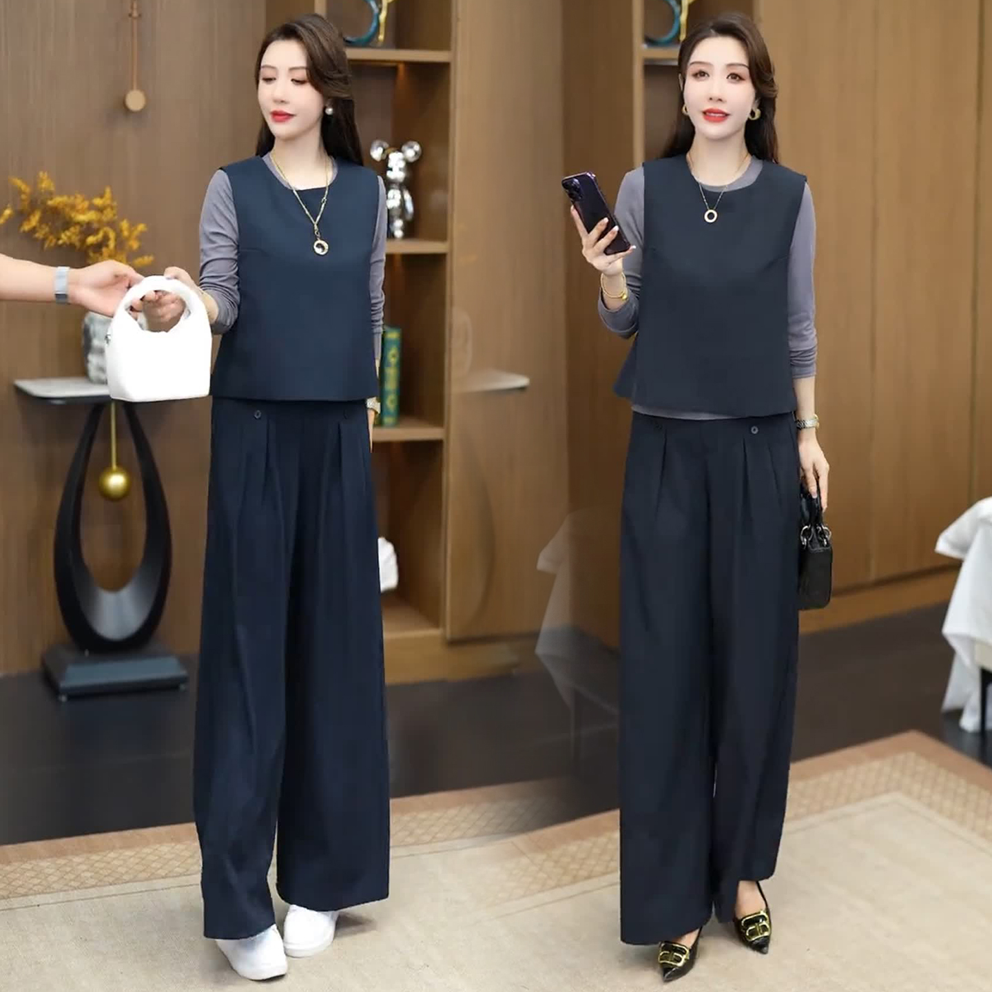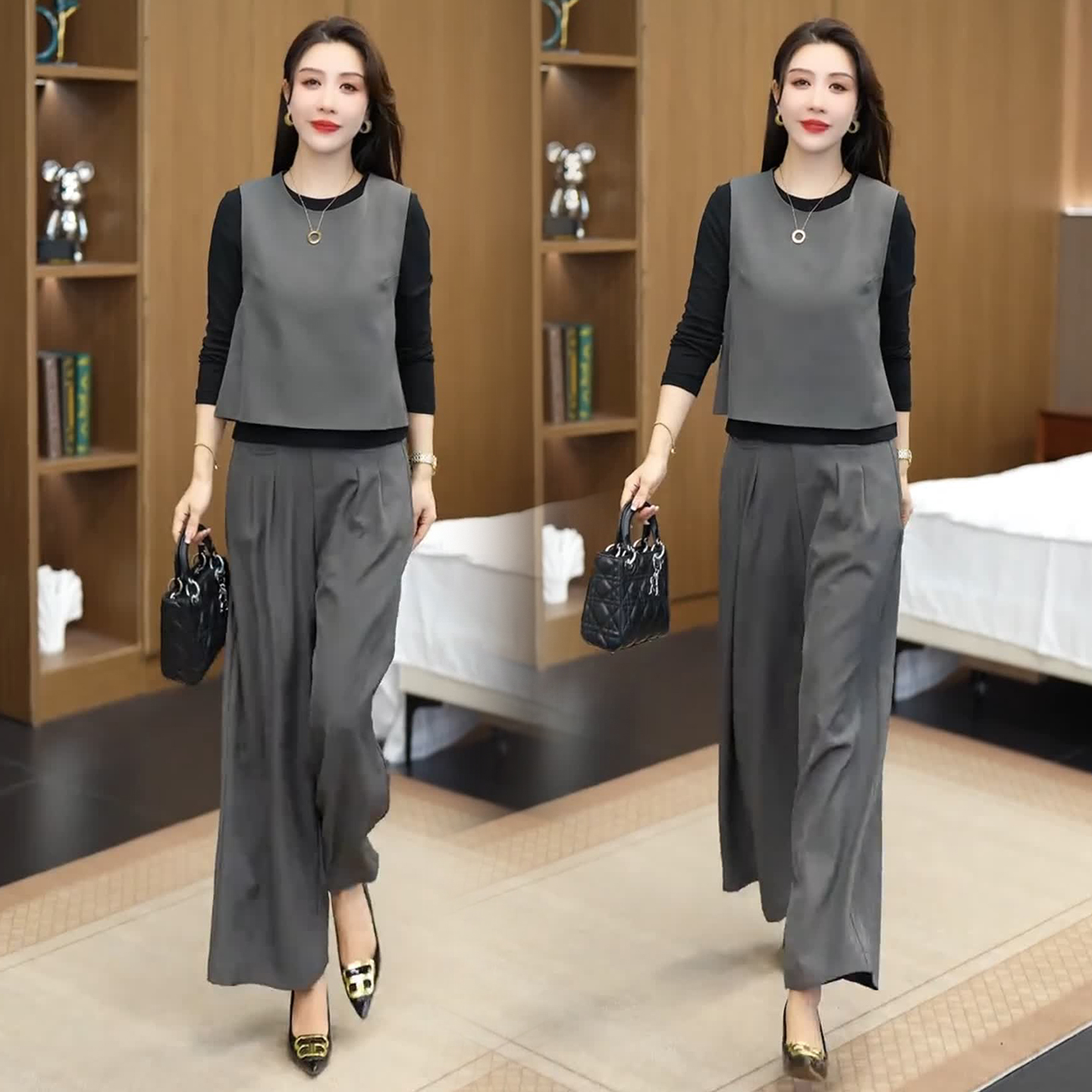 时尚套装女春秋新款设计感洋气质显瘦减龄打底衫马甲阔腿裤三件套
