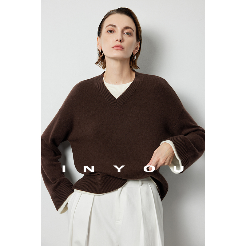 因由 宽松气质针织打底衫廓形假两件羊绒撞色随性显瘦V领毛衣女