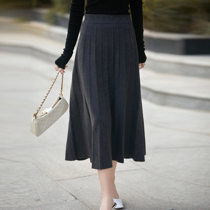 鄂尔多斯市秋冬羊毛半身裙女中长款高腰显瘦修身羊绒针织百褶裙女