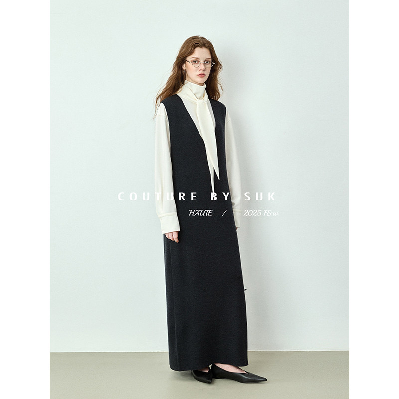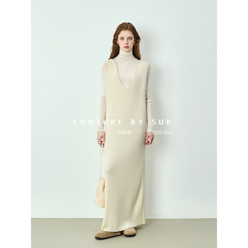 SUK 纯色逸裙!绵羊毛混纺无袖黑色深V领针织背心连衣裙长裙女