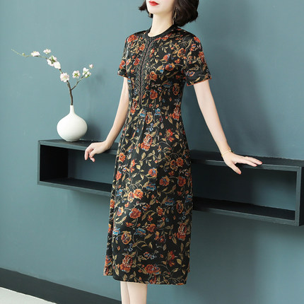 高端真丝连衣裙女夏季杭州丝绸印花桑蚕丝妈妈裙子显瘦2022年新款