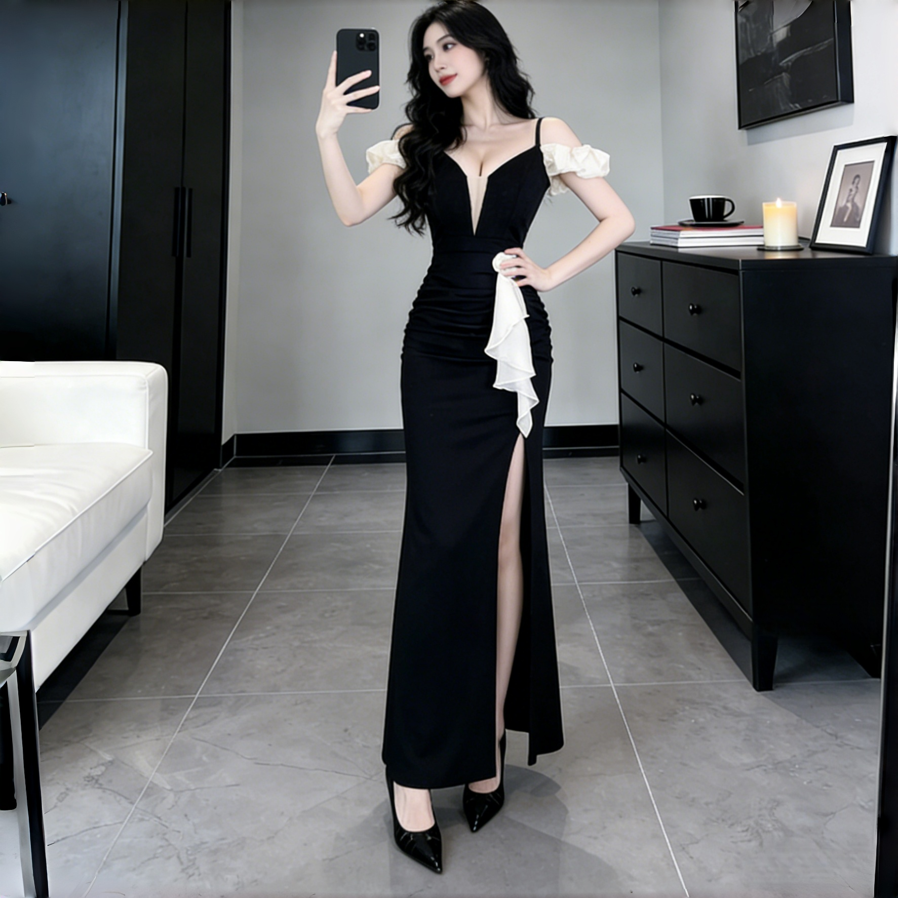 黑色性感深V领连衣裙女修身开叉鱼尾裙显瘦高级感轻奢晚礼服裙子