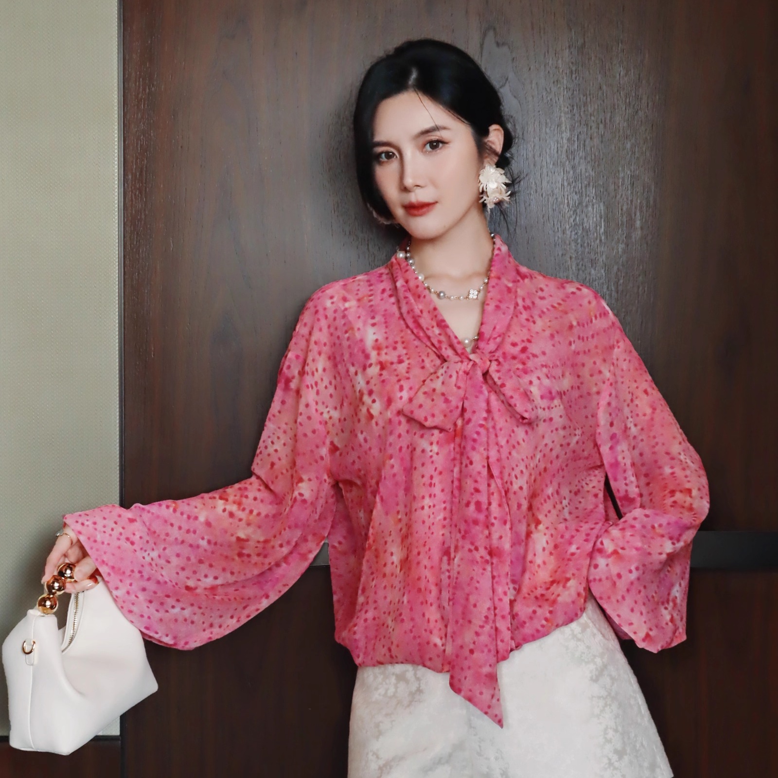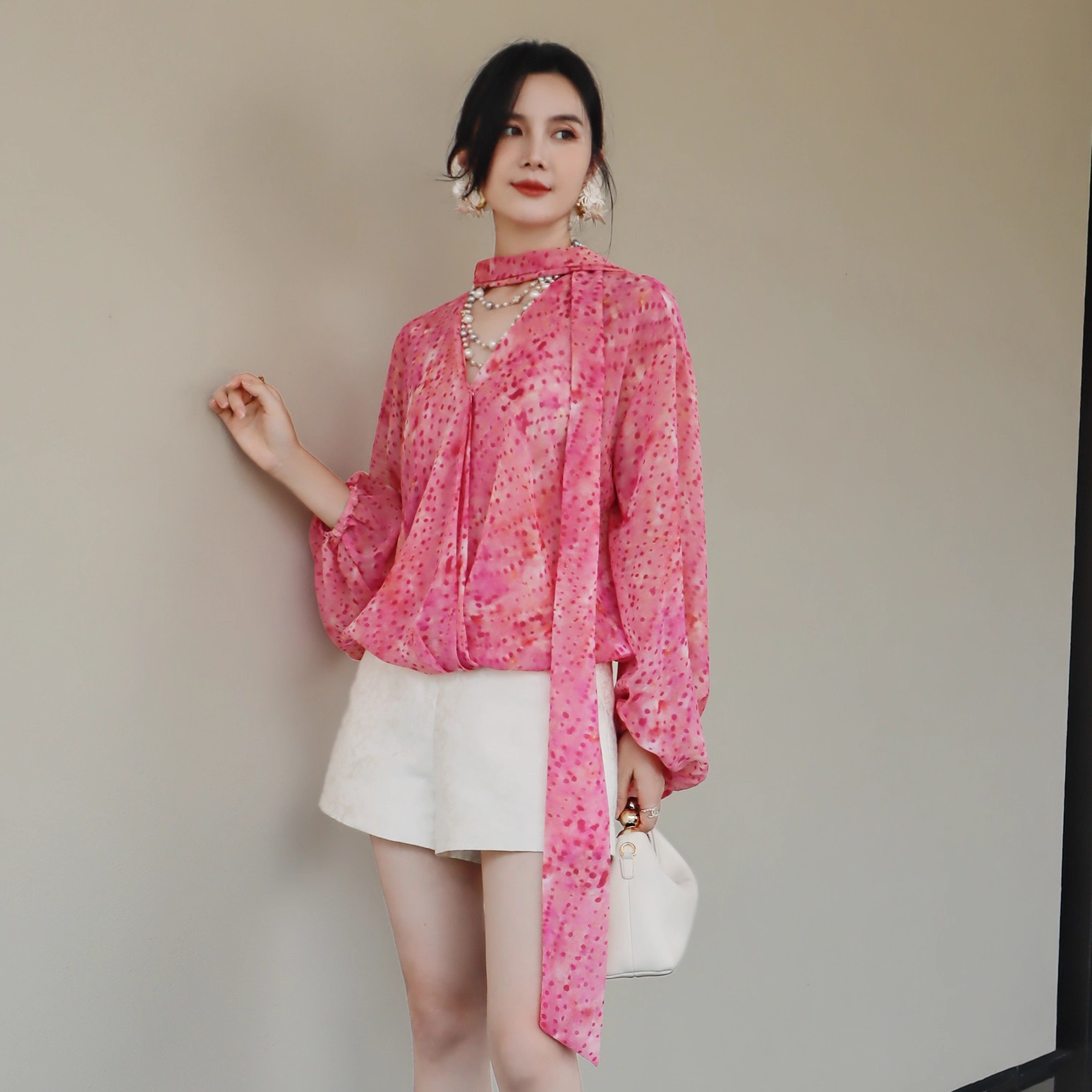 减龄桃粉波点秋季新款V领飘带设计灯笼袖法式高级感雪纺衫上衣女