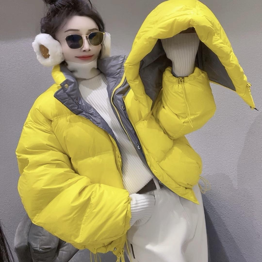 2025冬季短款白鸭绒活帽羽绒服女撞色百搭休闲韩版羽绒外套面包服