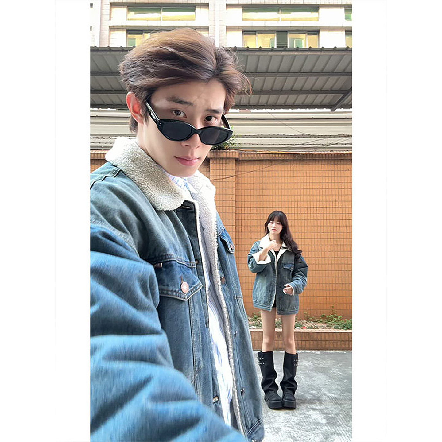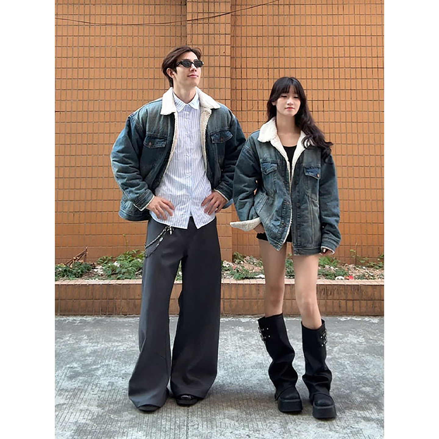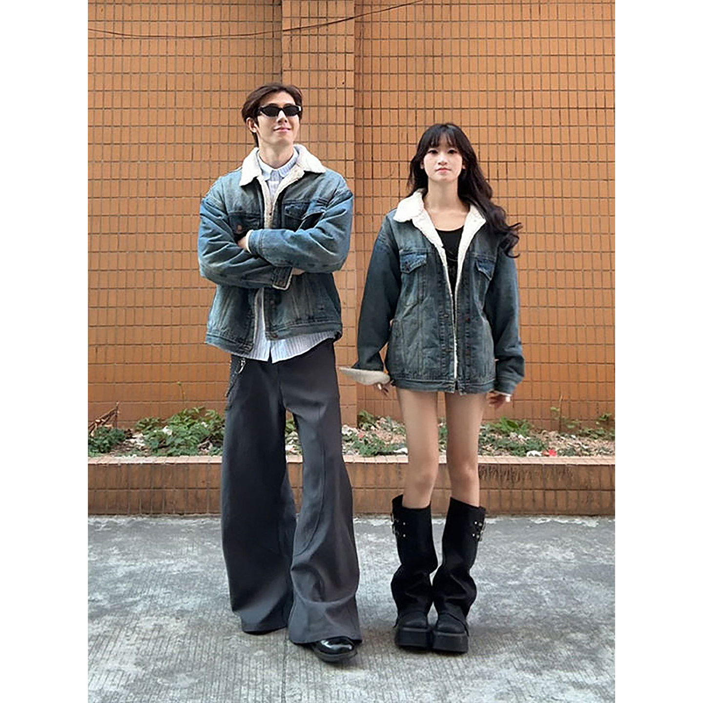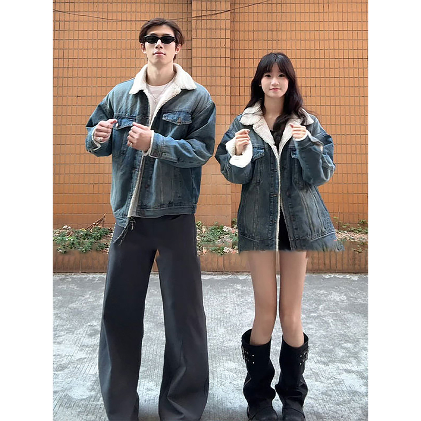 蓝色羊羔绒加厚翻领牛仔夹克男秋冬百搭潮流帅气保暖情侣棉服外套