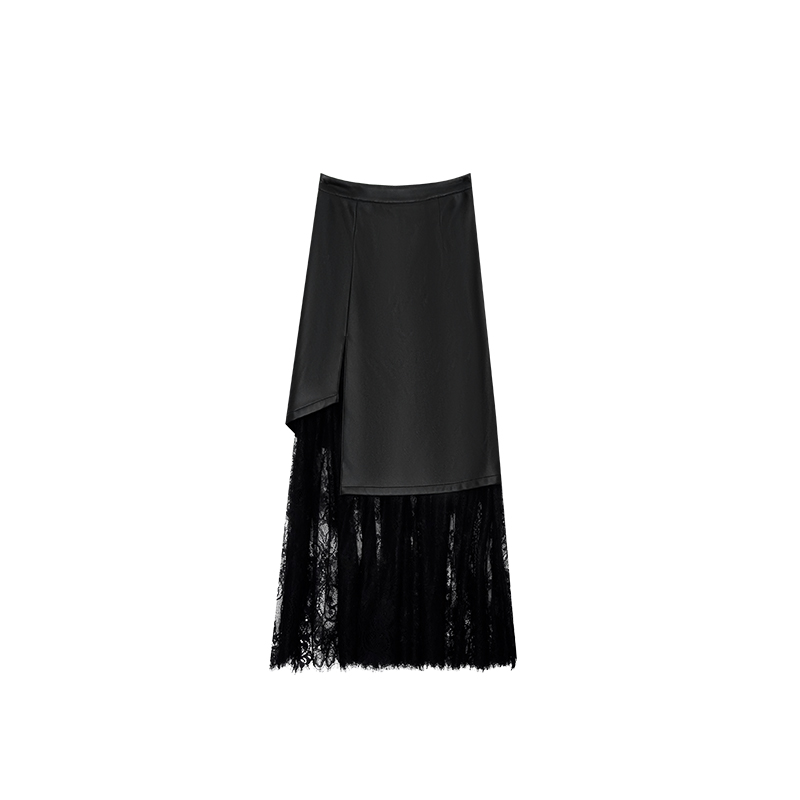 利达NEWDADADA法式设计感不规则蕾丝花边半身裙女中长皮裙子TQ738