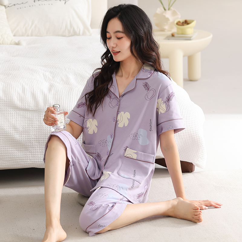 超大码睡衣女夏季薄款纯棉短袖七分裤胖MM200斤女士中年妈妈套装