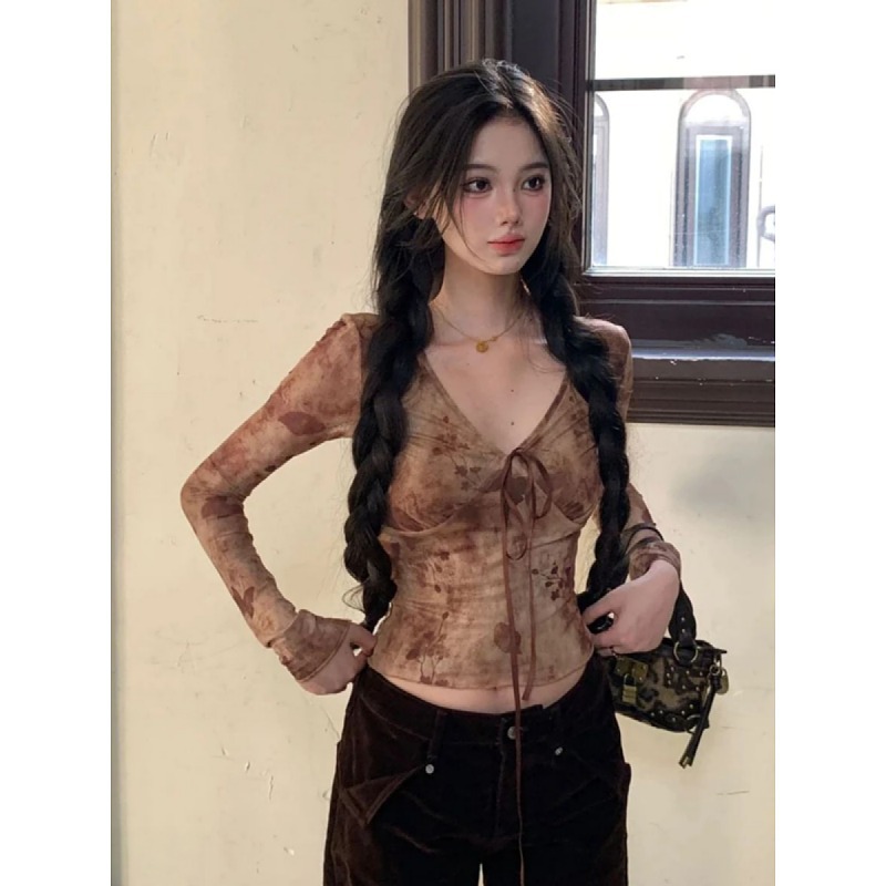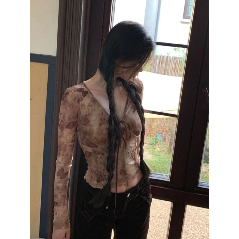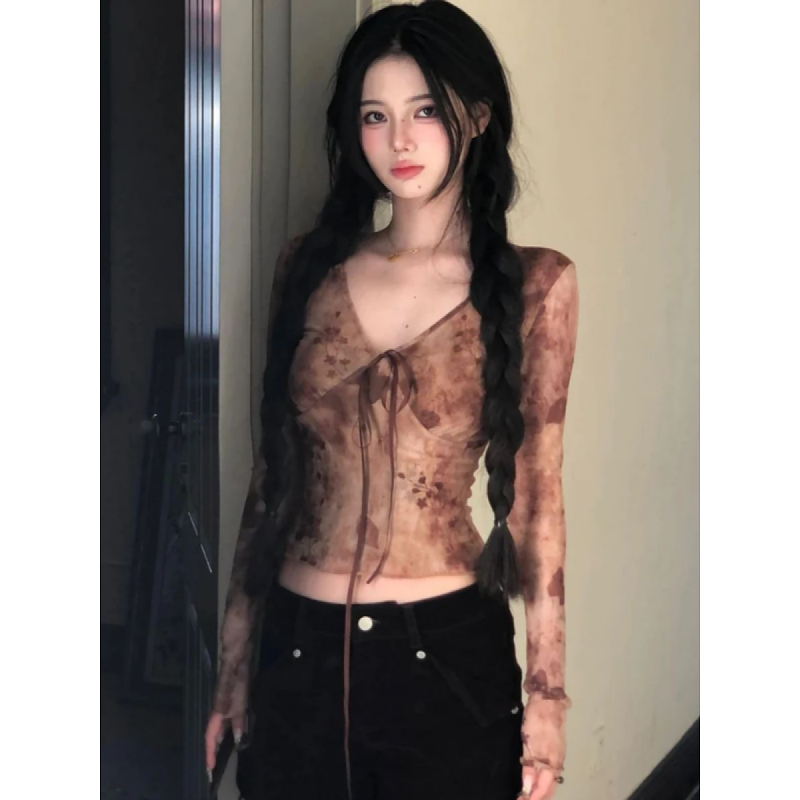 大码胖mm辣妹风晕染v领系带网纱上衣早秋新款显瘦时尚别致长袖T恤