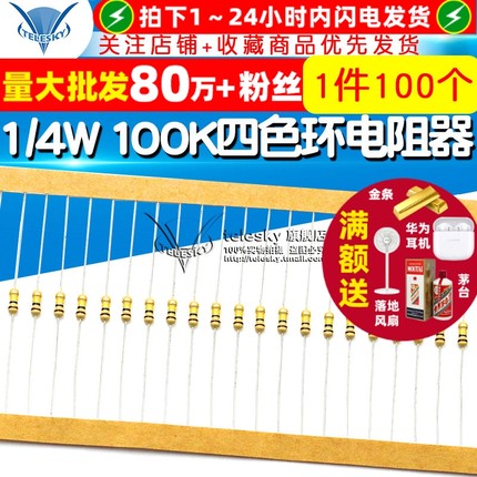 【TELESKY】碳膜电阻 1/4W 100K 5% 四色环电阻器 (100个)