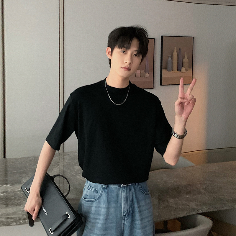 Hualun短袖夏季男款白色体恤衫潮牌潮流简约小高领T恤男圆领上衣