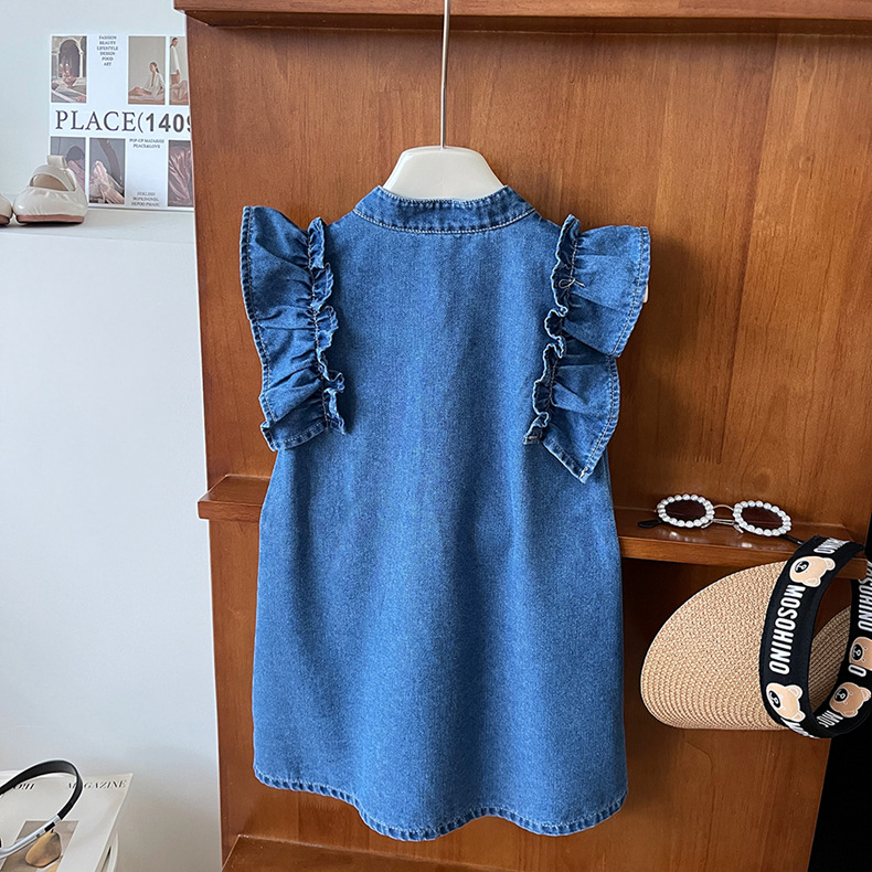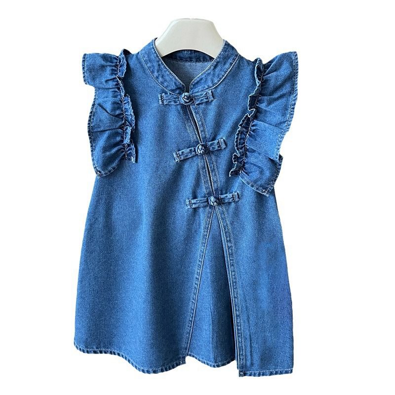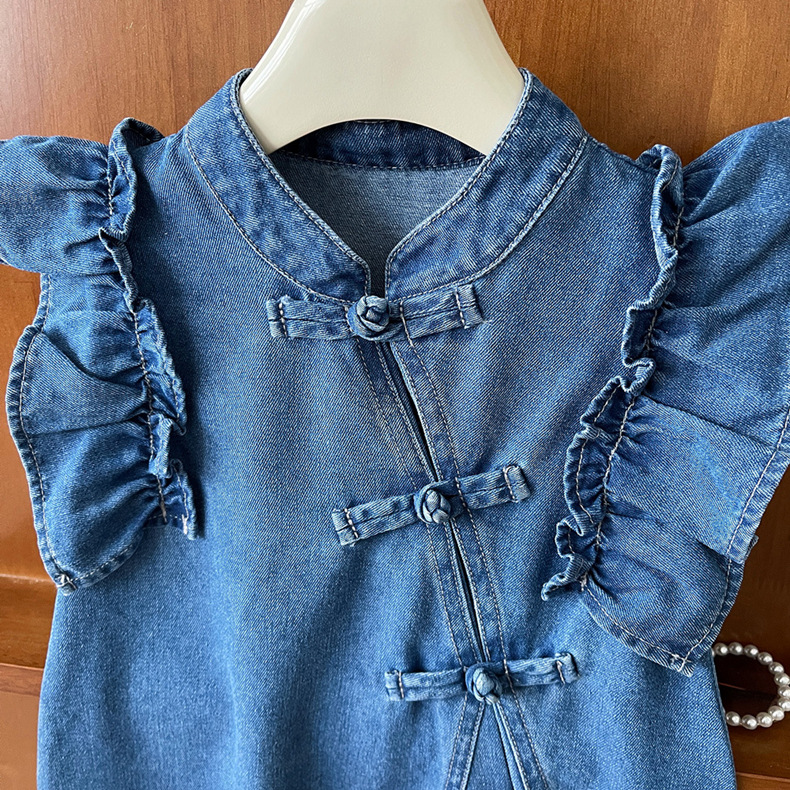 小女孩儿童夏季装新中式国风盘扣花边小飞袖无袖薄款软牛仔连衣裙