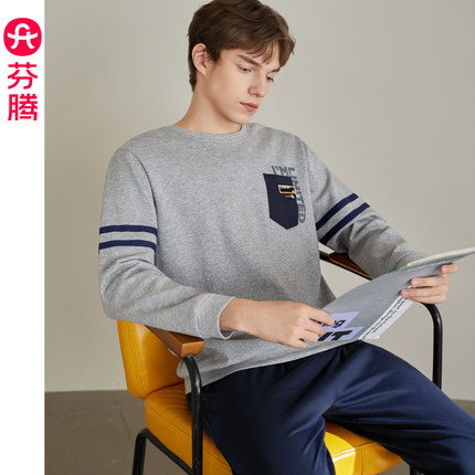 芬腾男士睡衣春秋季新款纯棉圆领长袖套装青年休闲宽松大码家居服
