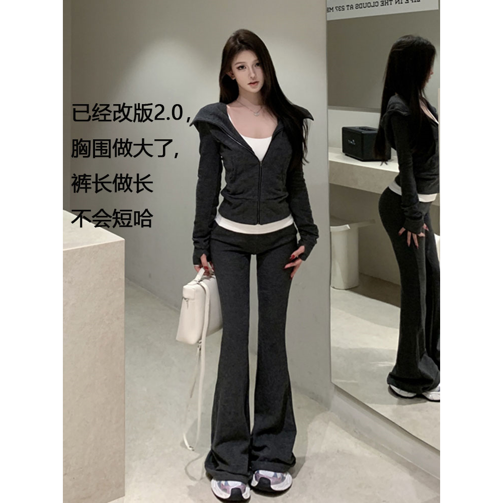 春秋季休闲运动套装女2025新款连帽卫衣外套微喇叭长裤显瘦两件套