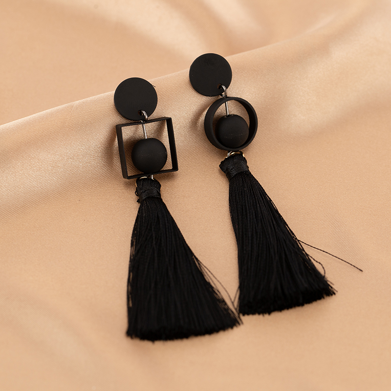 复古气质黑色不对称几何流苏耳环中式时尚长款蚊香盘耳夹无耳洞女