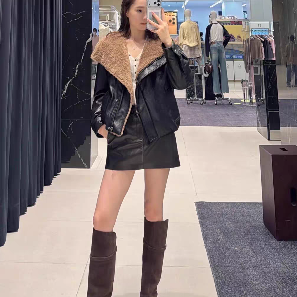 【秦岚同款】正品裙裤2025秋新品染整素皮高腰A字短裤MBE3SOT014