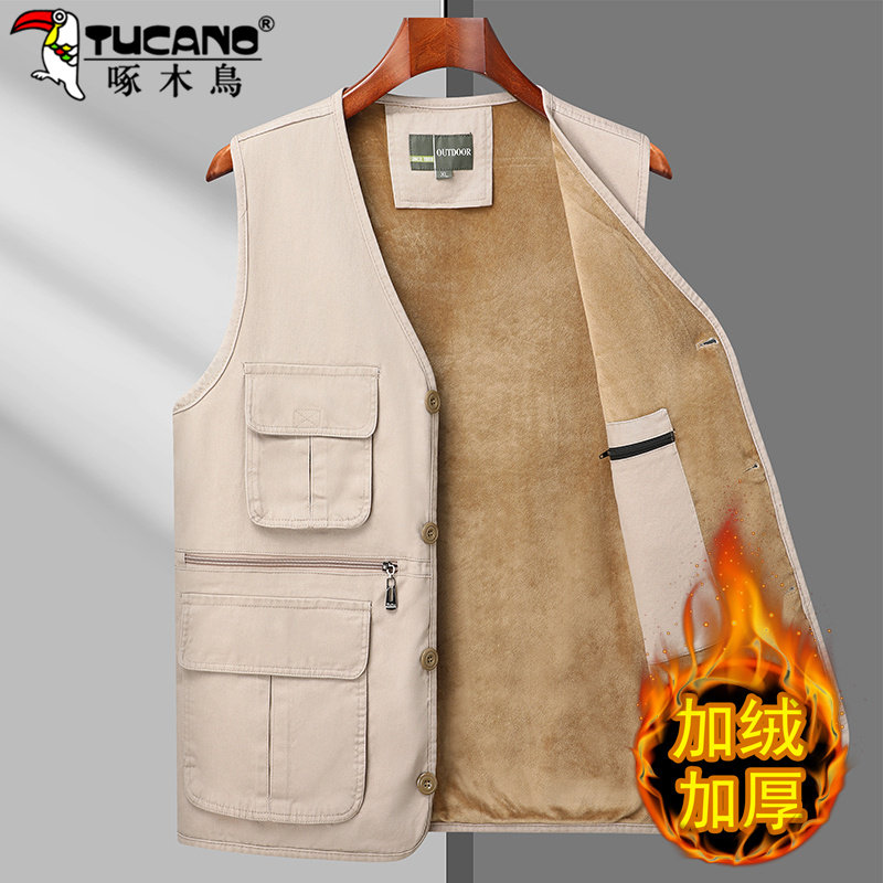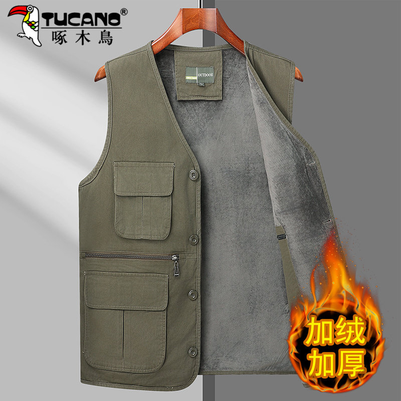 啄木鸟纯棉马甲男秋冬加绒加厚保暖马夹中老年爸爸多口袋外穿背心