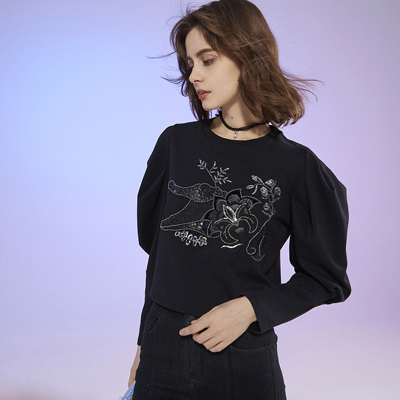莲灿正品裂帛浪漫波西米亚风贴补绣花灯笼袖套头卫衣