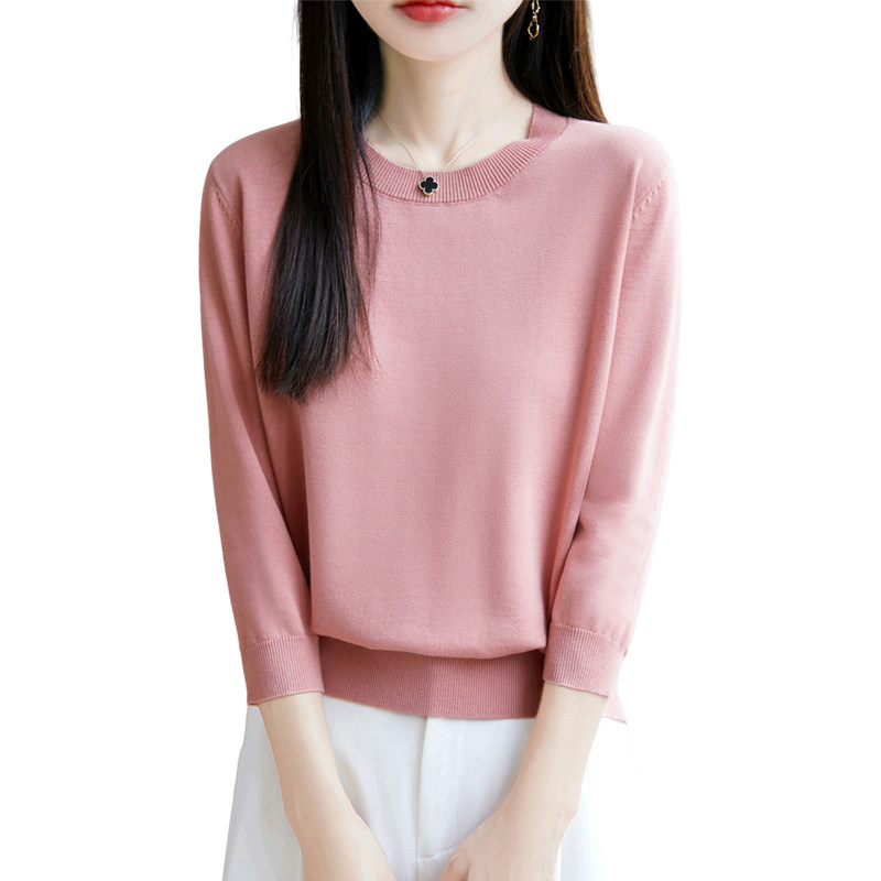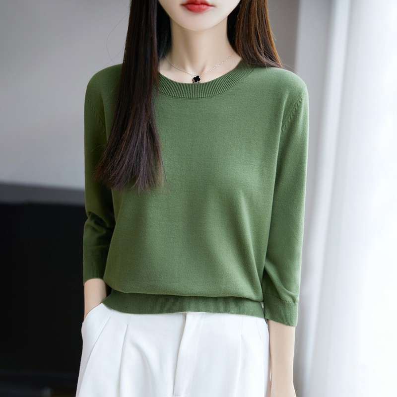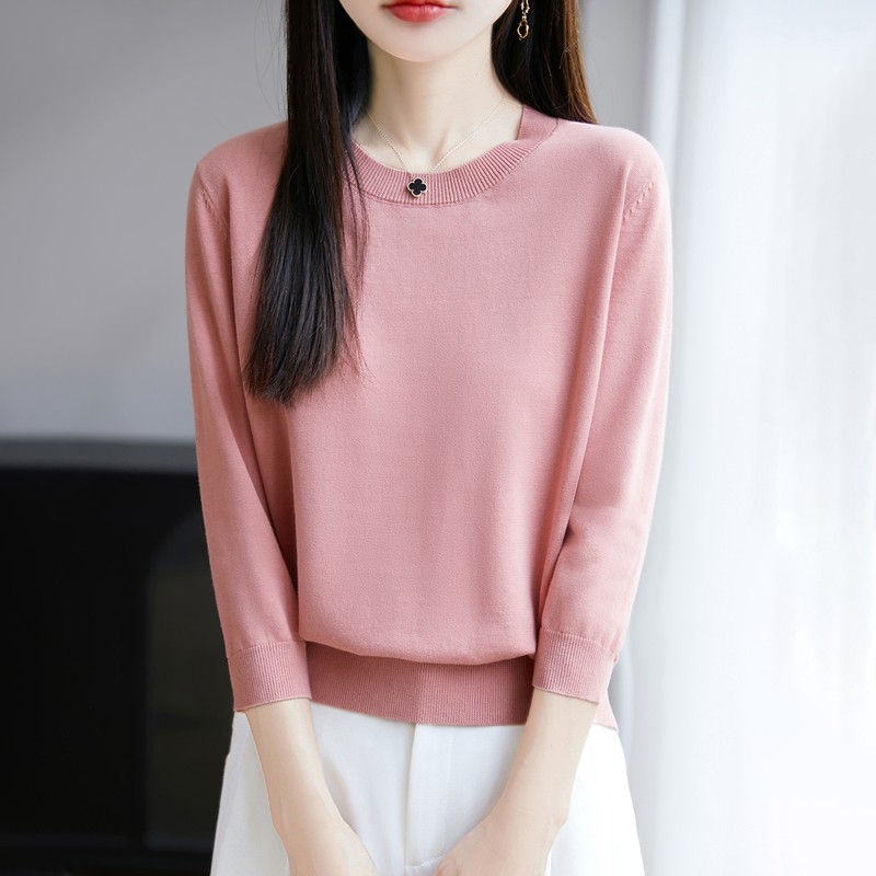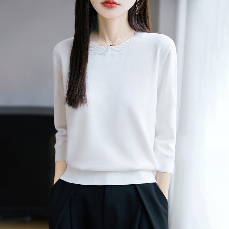 秋季新款七分袖纯棉针织衫短袖T恤女圆领全棉中袖打底衫正肩上衣