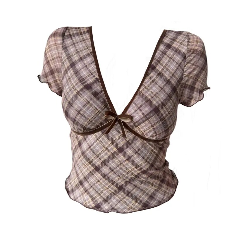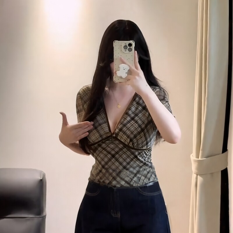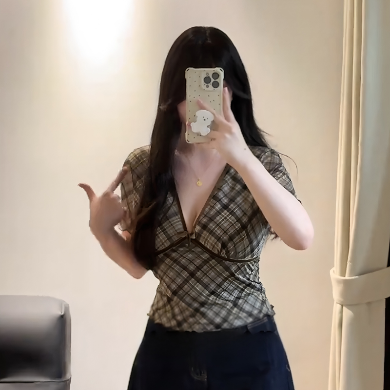 大码女装胖mm复古辣妹V领格纹正肩短袖t恤夏季显瘦气质掐腰小上衣