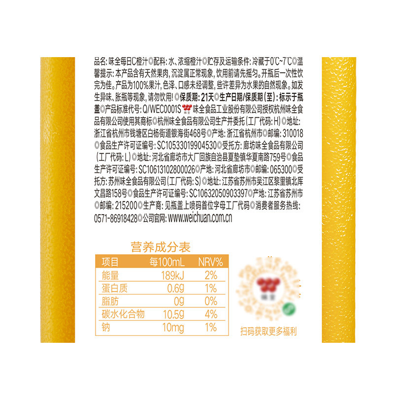 味全果汁饮料每日C橙汁900ml×1瓶装低温浓缩果蔬汁