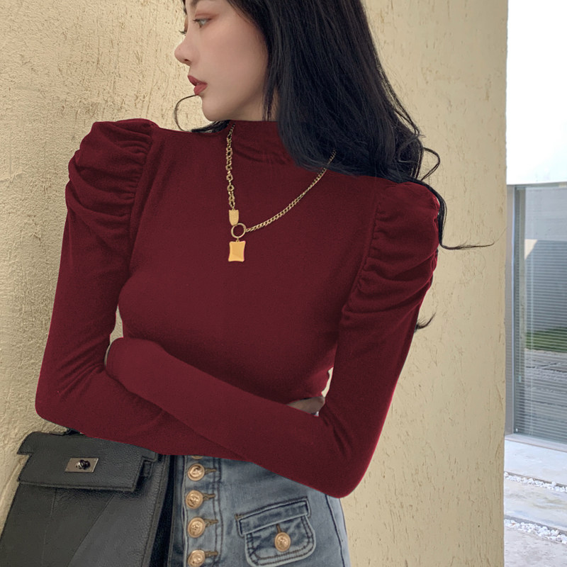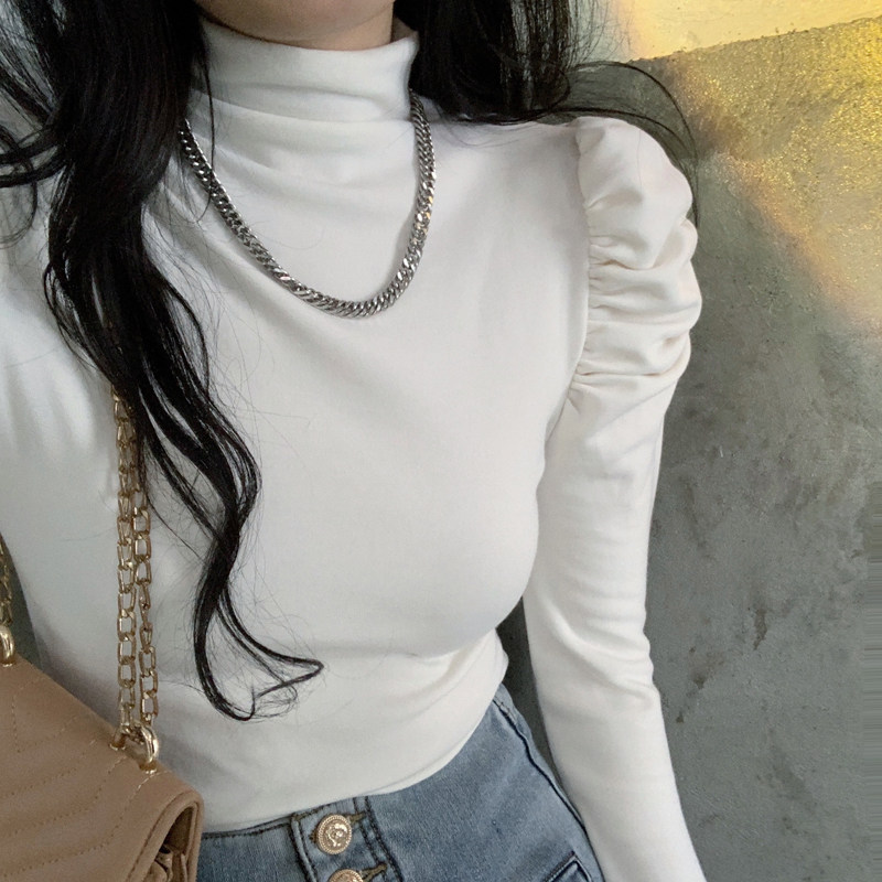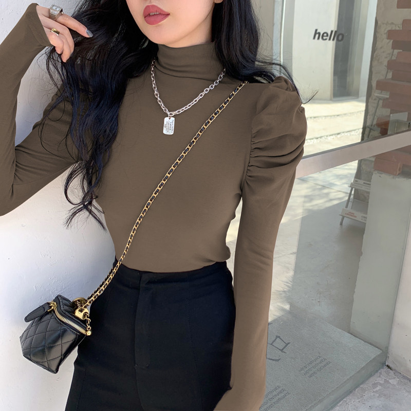 秋季半高领内搭打底衫女长袖设计感小众泡泡袖紧身t恤别致上衣棉