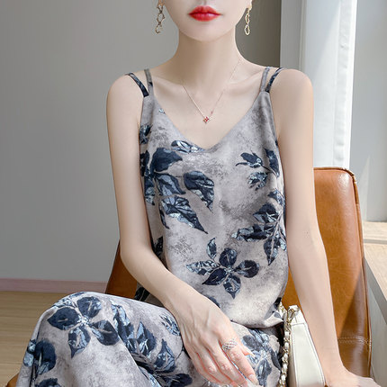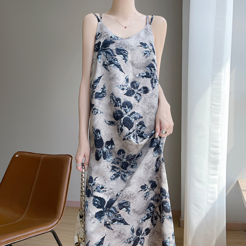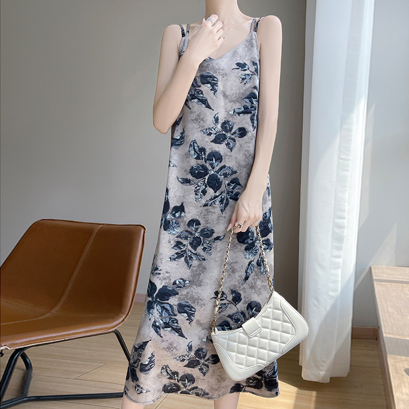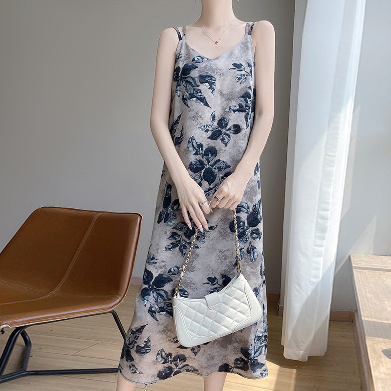 25夏季缎面真丝中长款连衣裙女V领拼色吊带背心长裙气质过膝A字裙
